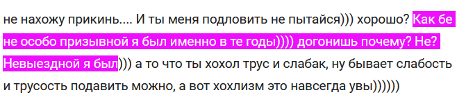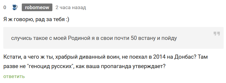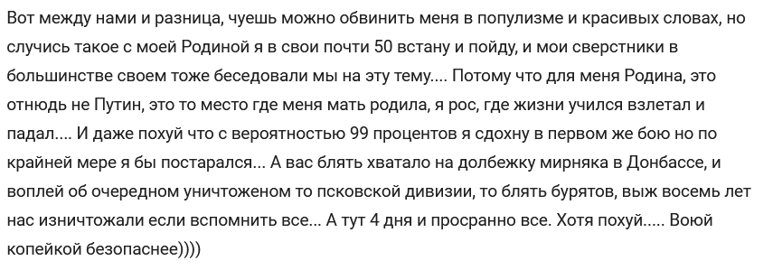 Эти долбаёбы ещё оправдывают одну войной другой. Мол донбасс бомбили 8 лет, пусть теперь и украинцы потерпят. И рассказывают, какой я хохлобот (лол), потому что против войны только сейчас стал (лол х3), их даже тот факт, что я с Донецка не останавливает, то есть в башке вообще ничего не щёлкает, пытаются доказать мне что-то, мол, они лучше меня знают.