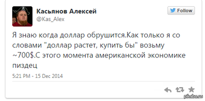 Так вот, вернемся к нашему многострадальному рублю. Его падение закончится тогда, когда ваша соседка-домохозяйка побежит в банк покупать баксы и евро, причем обязательно сообщит вам, что нужно купить доллар, "вон он как растет". И купит она их по максимальной цене. Это будет последний, короткий и быстрый, почти панический рывок цены, за которым начнется коррекция или даже разворот.