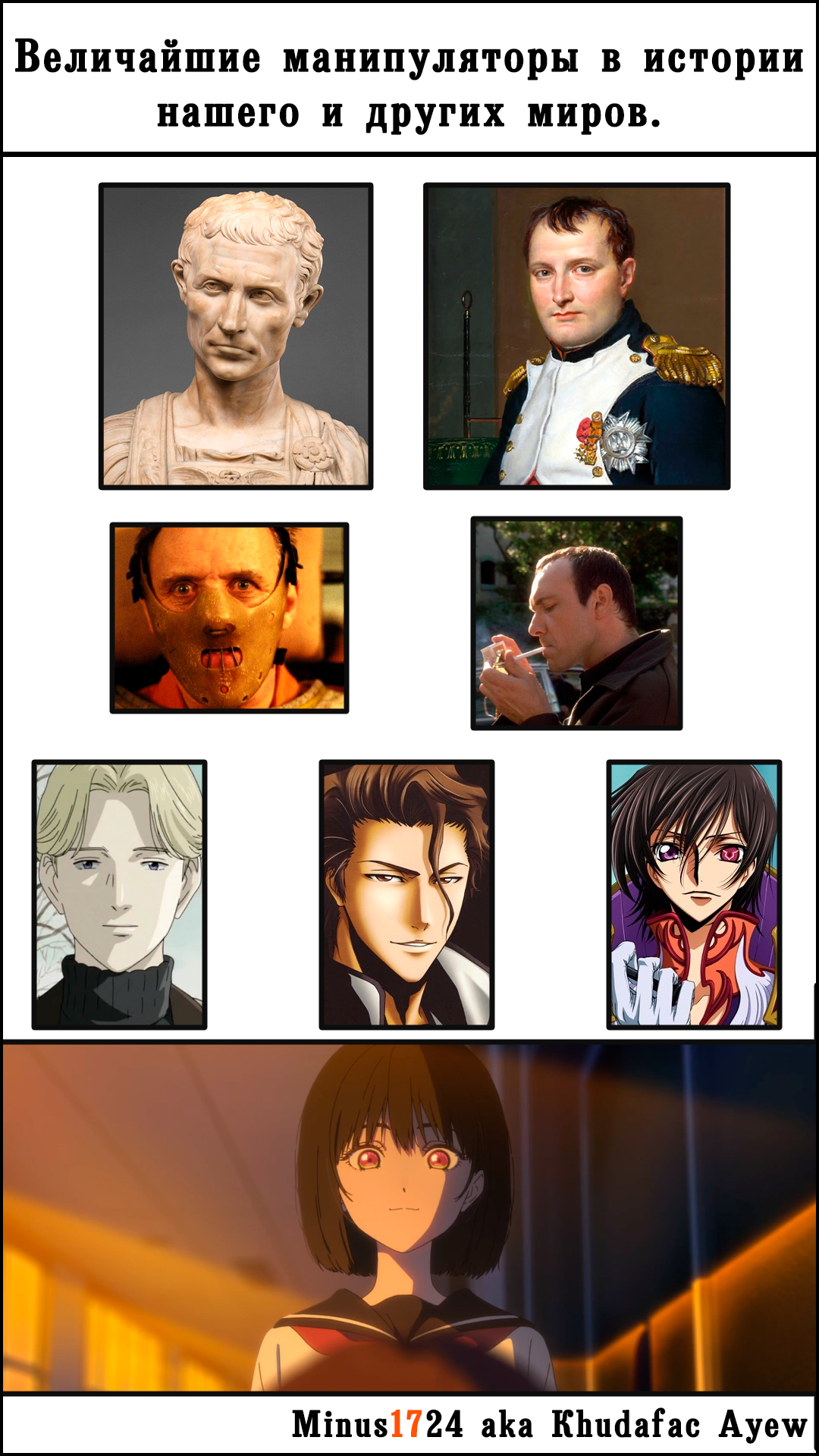 Регулярное напоминание: Это просто мем, шутка. Не пытайтесь на серьёзных щщах спрашивать почему у меня в одном списке реальные люди, кино и аниме персонажи. Хотя Юки Осанай действительно отличный персонаж манипулятор, для школьной повседневки. Если хотите узнать почему, пусть даже в шутку, но поставил её в один ряд с подобными персонажами и историческими личностями, то посмотрите аниме Shoushimin Series.