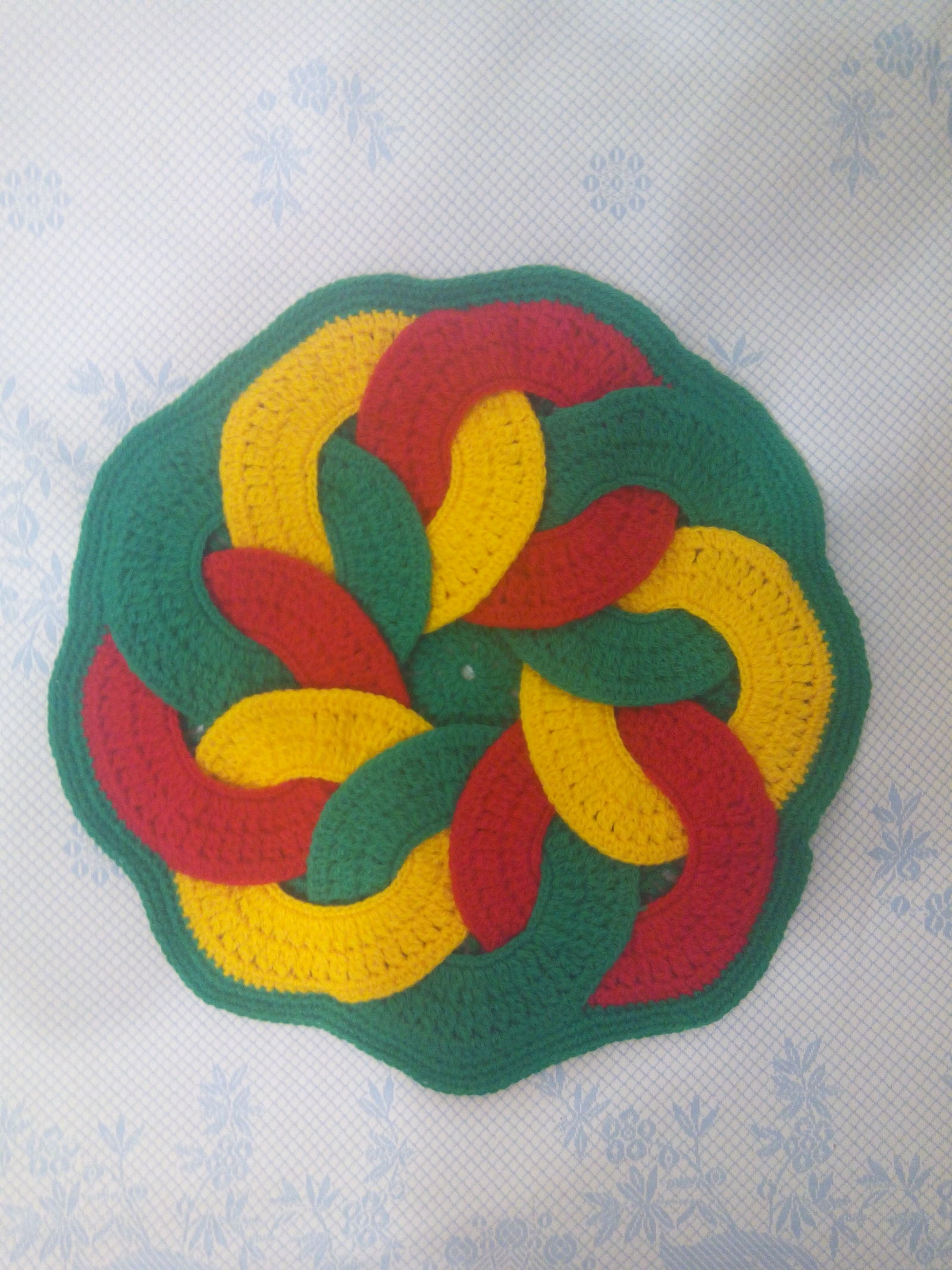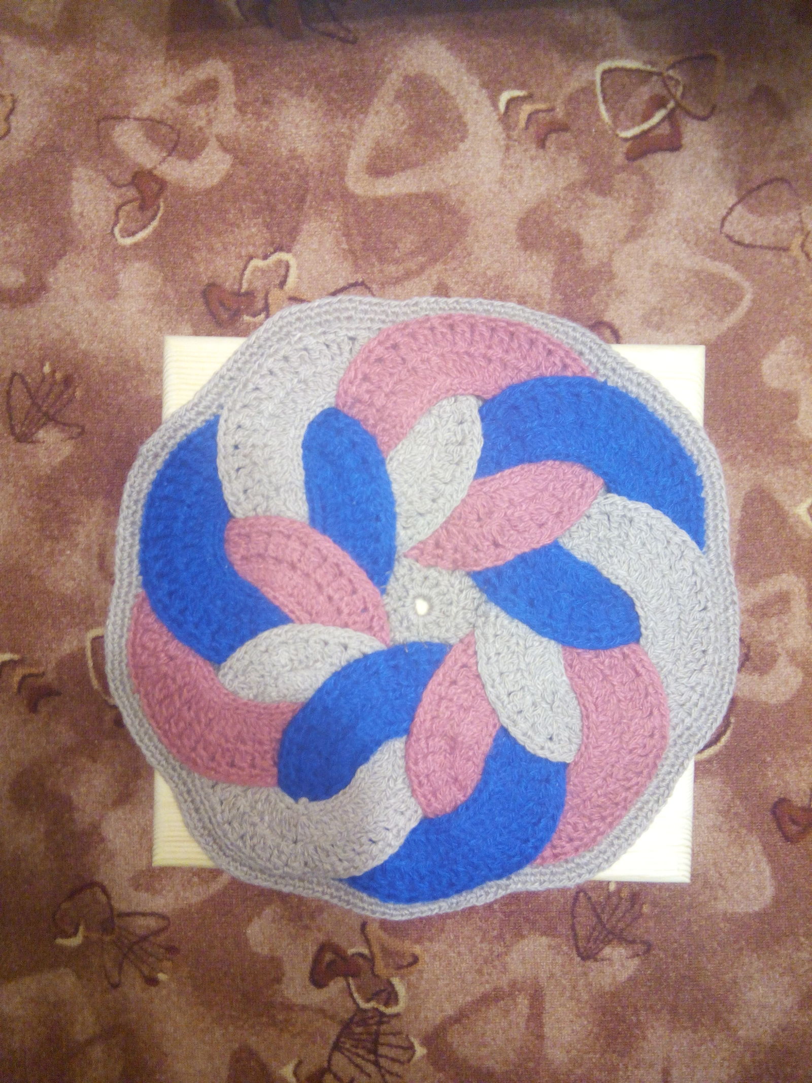 У другой коллеги по работе был юбилей, на него в качестве подарка был связан коврик на стул: