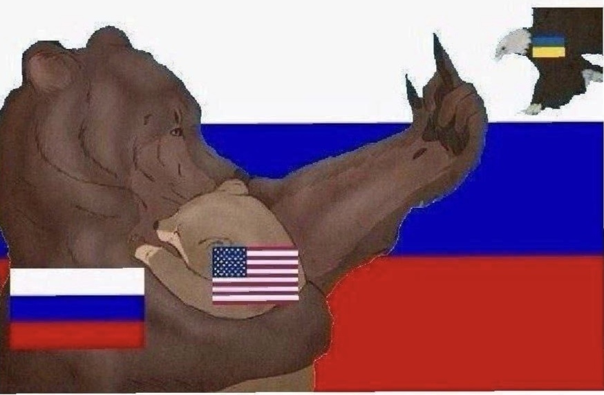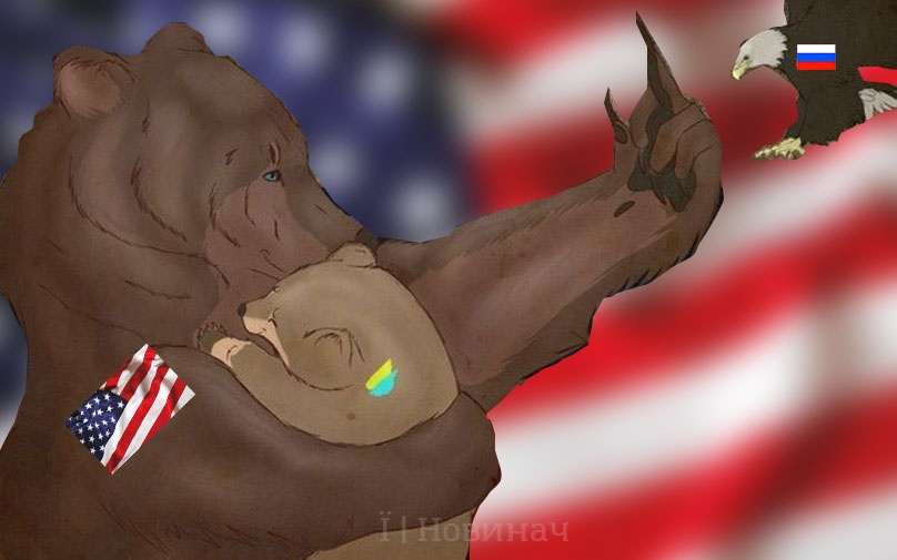 В ВК ходила картинка красивая во времена майдана, где медведь(РФ) на руках держал медвежонка (укр) и показывал фак орлану (сша)...
