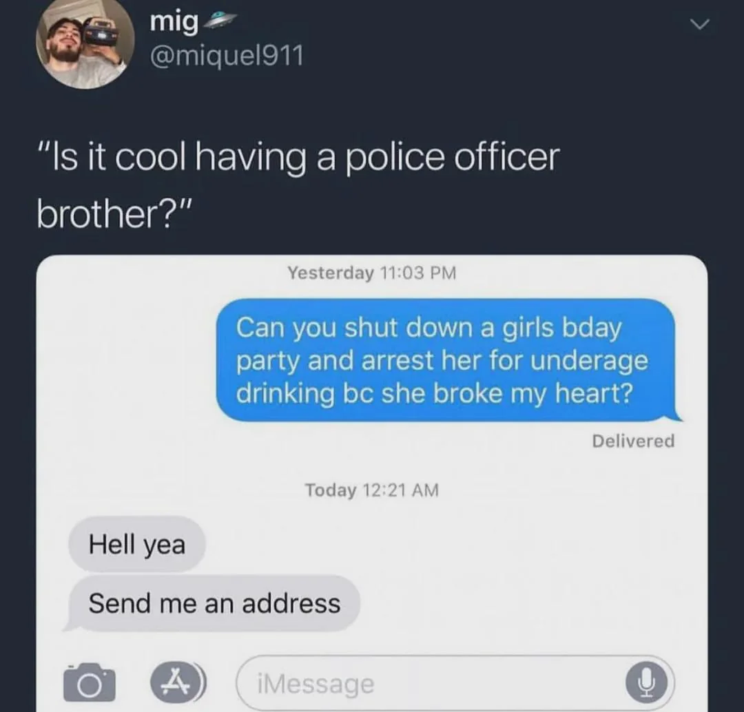 424 asanbek.best Отношения Когда твой брат офицер полиции 1 год назад Перевод:- Можешь ли ты прекратить девичник и арестовать ее за употребление алкоголя до совершеннолетия, потому что она разбила мне сердце? - Черт возьми, да. Пришли мне адрес Отношения Мужчины и женщины День рождения Вечеринка Несовершеннолетние Разбитое сердце Полиция Брат Скриншот 18 4 2 1 Ещё 0