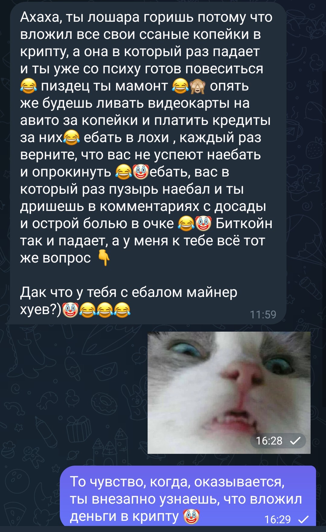 Хз с чего, но какой то индивидуум решил что я прогорел на крипте 🤡