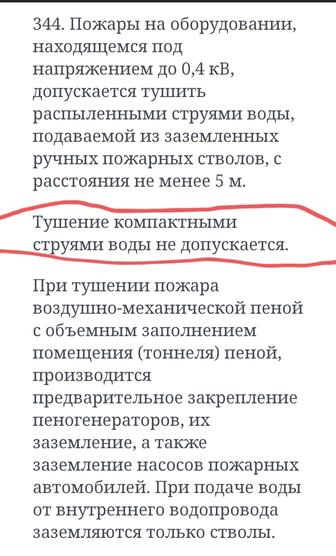 344. Пожары на оборудовании, находящемся под напряжением до 0,4 кВ, допускается тушить распыленными струями воды, подаваемой из заземленных ручных пожарных стволов, с расстояния не менее 5 м.