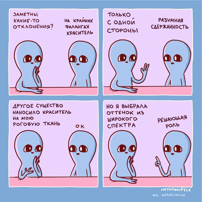 Вот ты хотя бы сказал про маникюр. А у меня на прошлой работе одна коллега, которой не с кем особо поговорить, каждый раз после маникюра приходила на работу и выносила мозг этим своему соседу. Ох, надо было видеть его выражение лица в эти моменты) Мало того, что ему девушка эта не очень нравилась как человек, так еще и слушать про ее ногти - это уже совсем перебор