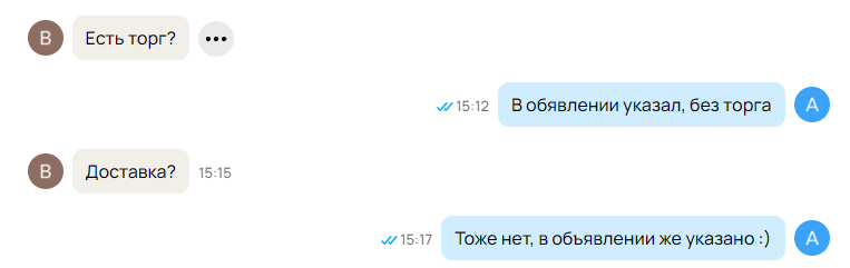 13 OXOTHuK76 1 год назад Когда в Авито указал "без торга", "самовывоз" Блин, люди, кто такие вопросы задает, что с вами? :) [моё] Авито Юмор Продажа Переписка Скриншот 1 1 Ещё 0