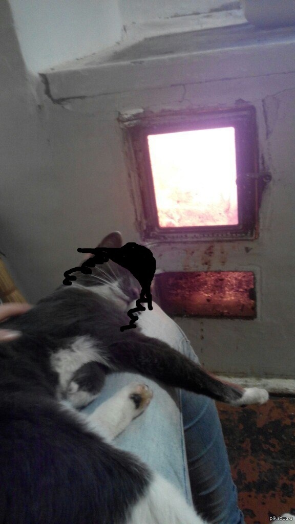 Сын вскакивает, бросает кота в печку, захлопывает печную заслонку и орет:
