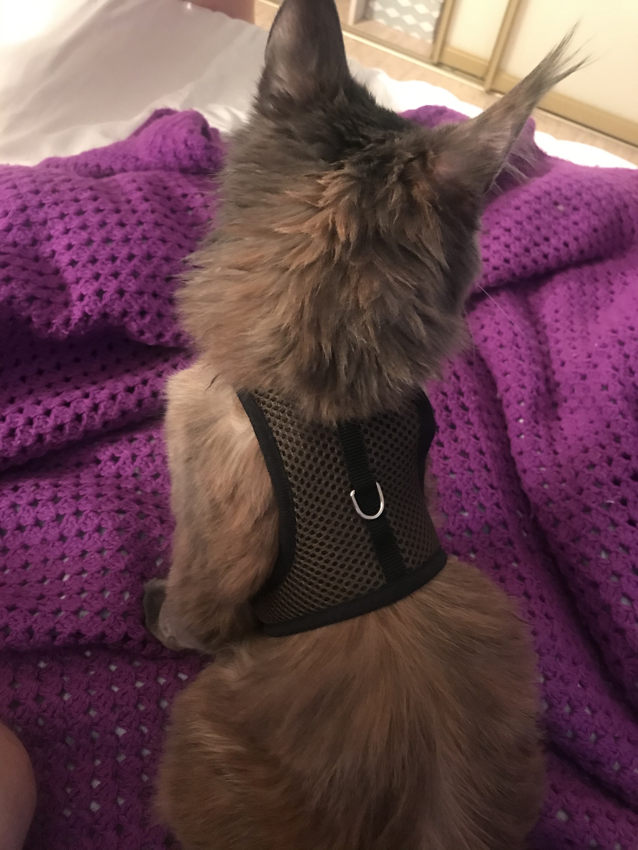 Вчера шлейку одели, для выгула или как там ее(она проще попоны одевается, не надо завязывать) то же работает.