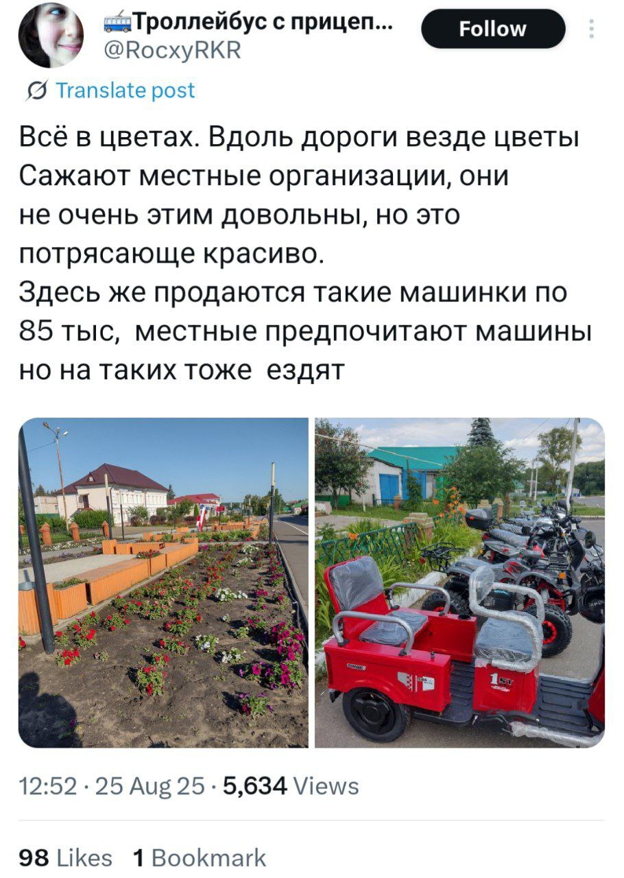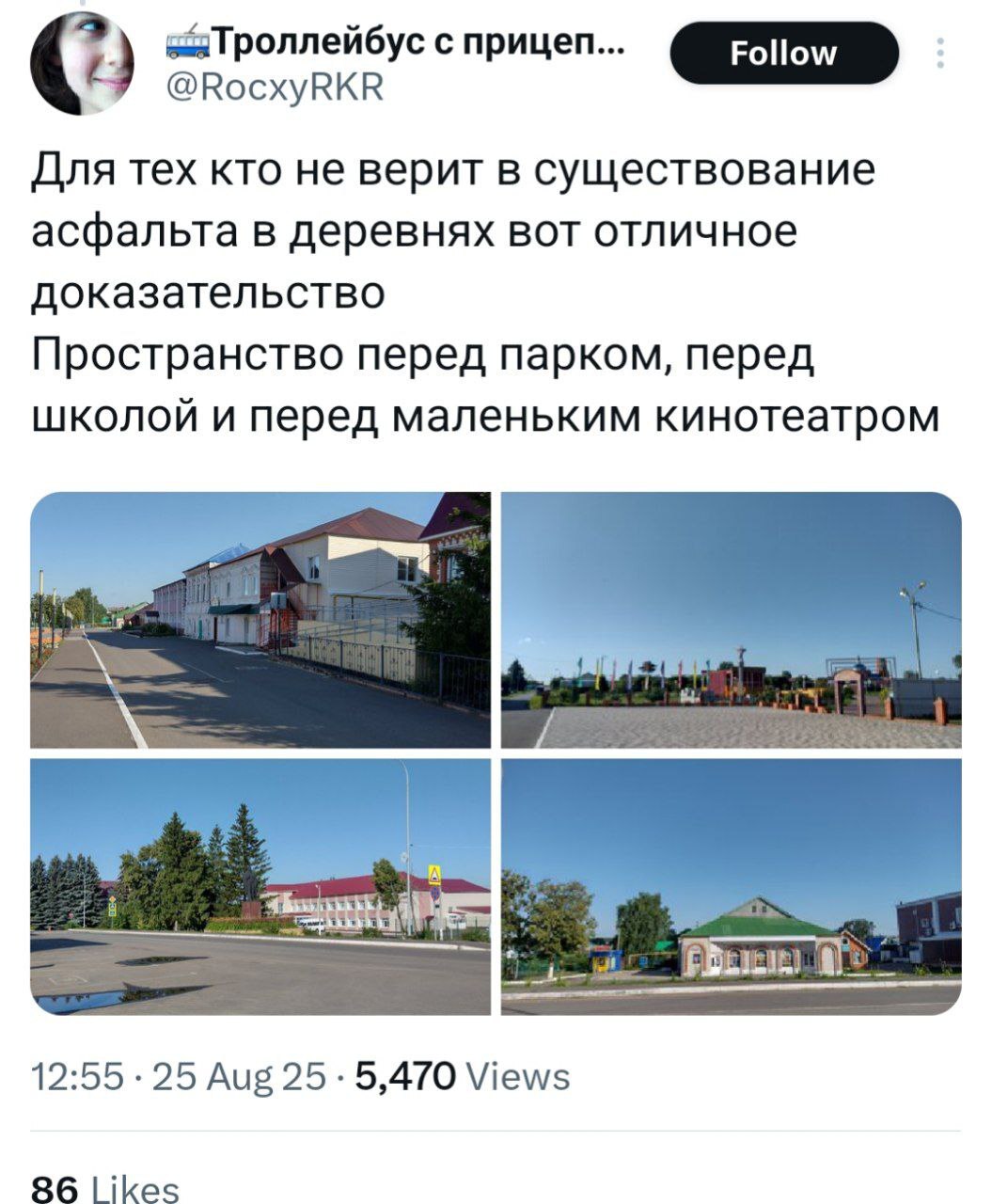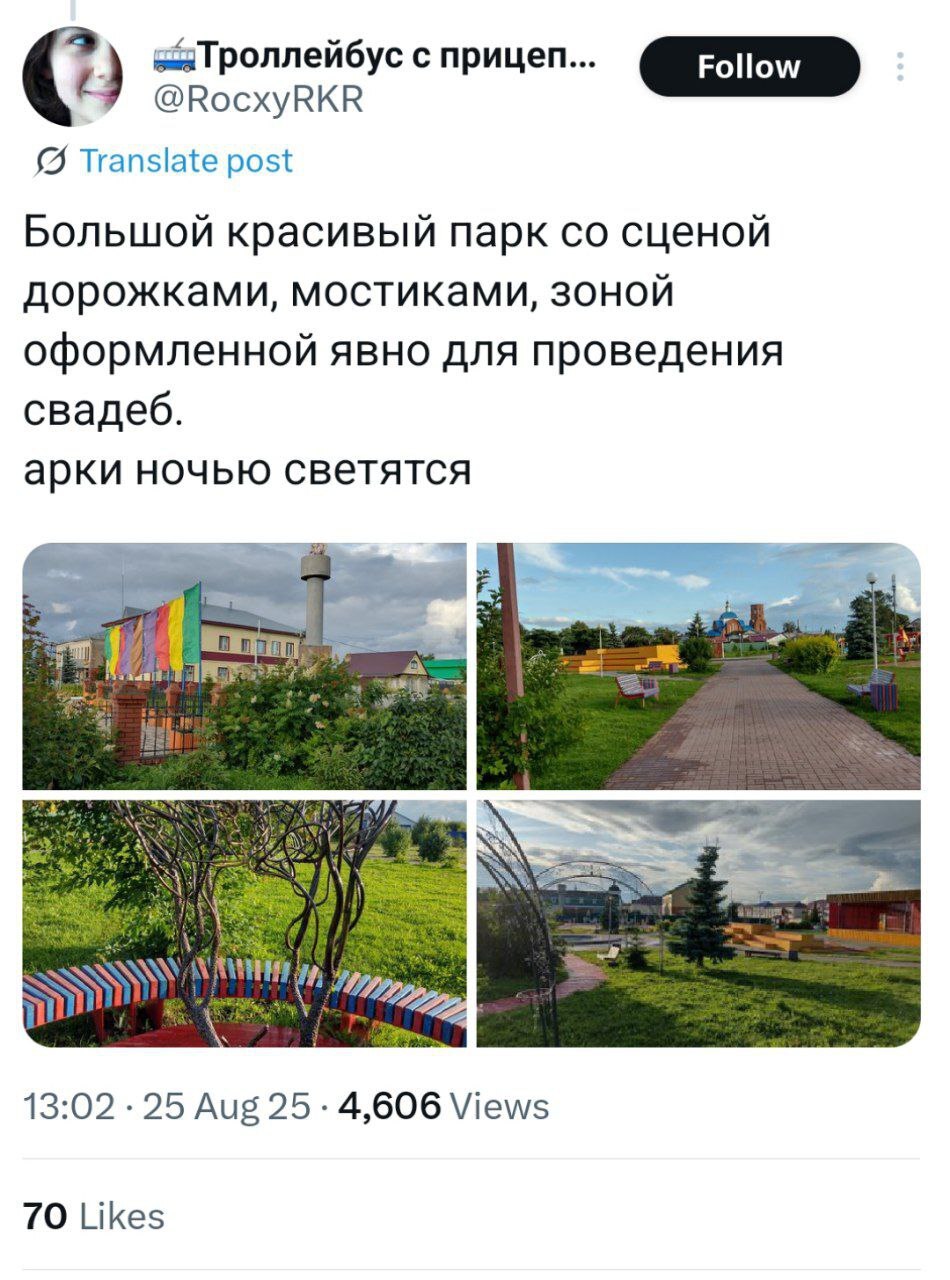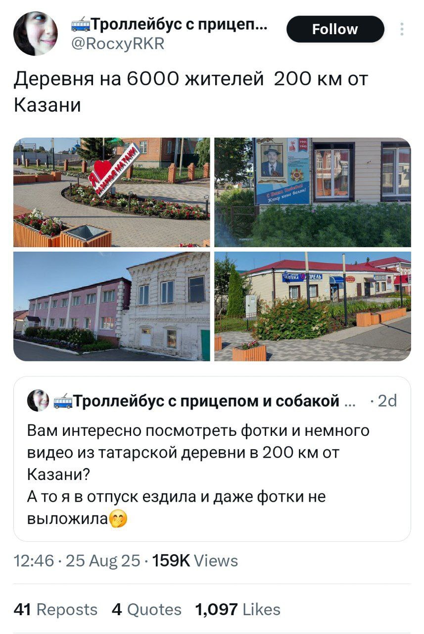 8461 BorschRusso Когда все-таки отъехал от Москвы, а там... все хорошо!1 4 месяца назад X (Twitter) Скриншот Россия Москва Казань Деревня Благоустройство Парк Красота Городская среда Асфальт Цветы Магазин Кинотеатр Школа Длиннопост 609 129 49 13 1 1 1 Ещё 2