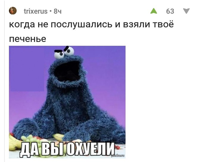 Rust007 Когда взяли твое печенье. 8 лет назад Ссыль на коммент #comment_93990369 Скриншот Комментарии Печенье Cookie Monster