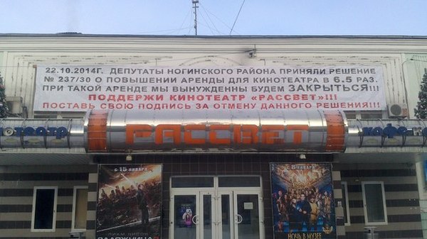 Друзья! Кинотеатр "Рассвет" снова пытаются закрыть! На этот раз, чтобы отобрать здание в центре города для строительства очередного торгового центра, совет депутатов Ногинского района поднял аренду для кинотеатра в 6,5 раз, что в 4 раза выше рыночной стоимости! Учитывая ситуацию в экономике, кинотеатр просто не выживет и ему придется закрыться. В 2012 году здание кинотеатра было незаконно продано, но тогда жители города отстояли свой «Рассвет». Вторая битва за Рассвет начинается сегодня!