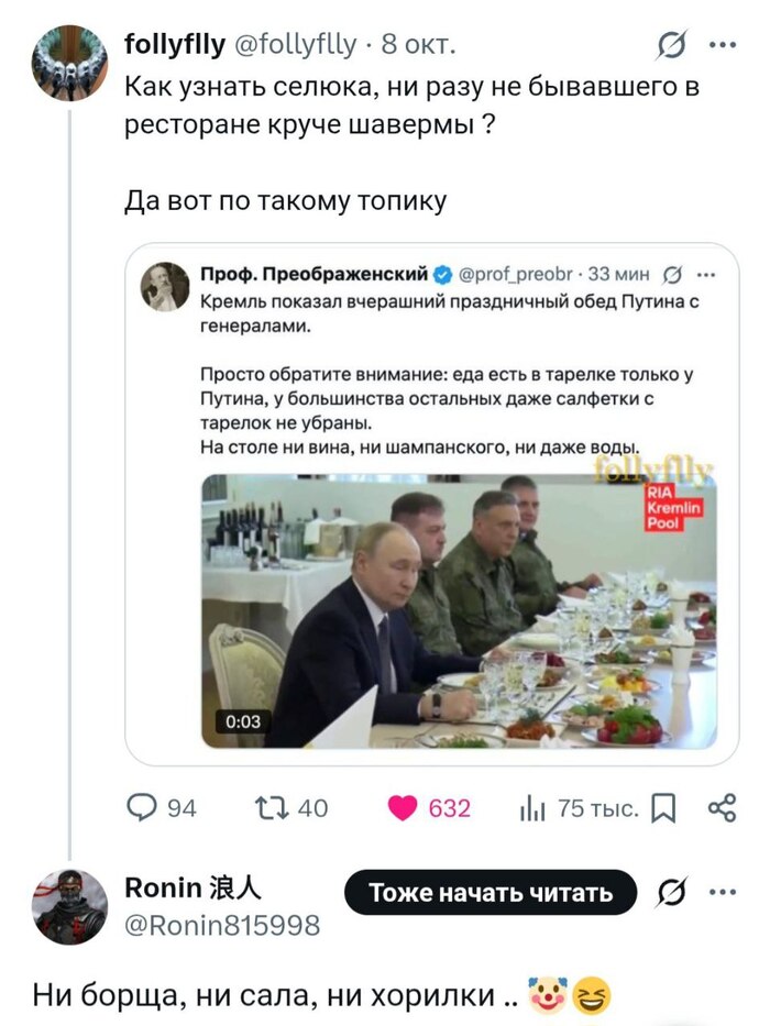 529 BorschRusso 1 день назад Когда-нибудь твиттерские "эксперты" сходят в ресторан...3 Источник X (Twitter) Скриншот Политика Россия Владимир Путин Дичь Бред Fake News Либералы Ссылка Ложь Длиннопост 101 1 Ещё 0