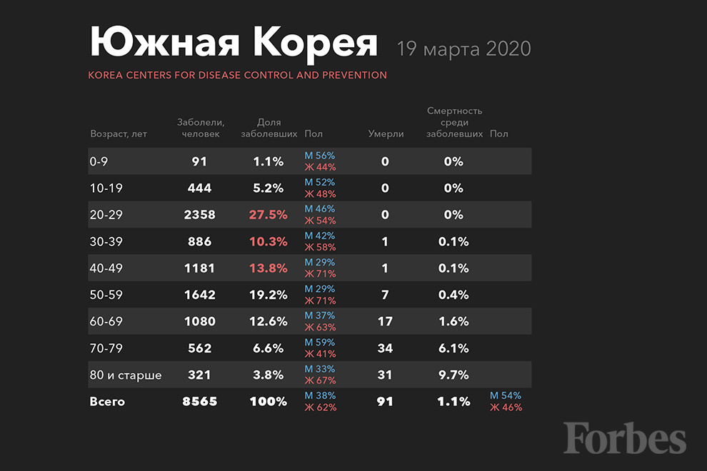 Судя по китайским и итальянским данным, и среди заболевших, и среди умерших из-за коронавируса преобладают мужчины. В Южной Корее зараженных женщин оказалось гораздо больше зараженных мужчин, но смертность все равно значительно выше среди мужчин.