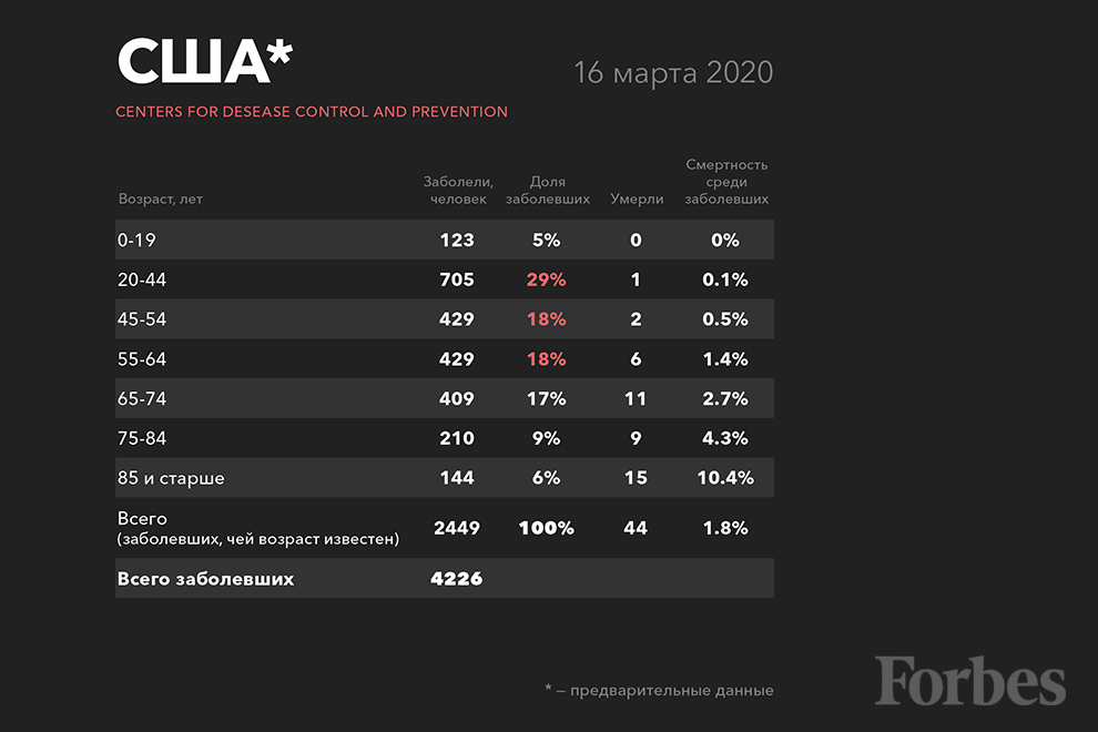 В отчете по США приводятся данные о 4226 случаях заболевания COVID-19, зарегистрированных с 12 февраля по 16 марта 2020 года. Авторы также указывают, что в Штатах часто болеют пожилые люди, проживающие в учреждениях по уходу за хроническими больными. На людей старше 65 лет пришлось 31% случаев заболевания и 80% смертей, связанных с коронавирусом. На пожилых людей также приходится 45% всех госпитализаций и более 50% госпитализаций в отделение интенсивной терапии. отсюда