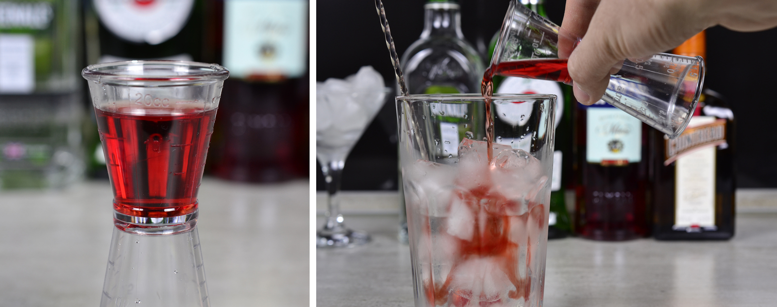 Охлаждаем смесительный бокал стируя (перемешивая) лед, сливаем из него натаявшую воду и начинаем собирать в него компоненты коктейля.
