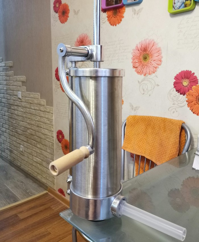 На всякий случай снова охлаждаем фарш, и далее вступает в дело гвоздь программы! Колбасный шприц, ох как он облегчает жизнь колбасника! Но если у вас нет шприца это не проблема, можно набивать через мясорубку а можно и пальцем набить, как делают белорусы!