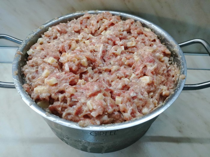 Всё специи из расчёта на кг мяса, сыр в учёт не берём. Так же добавляю 200гр воды на кг мяса ( можно с использованием фосфатов) далее фарш хорошо вымешиваю ручным миксером, до образования белых волокон