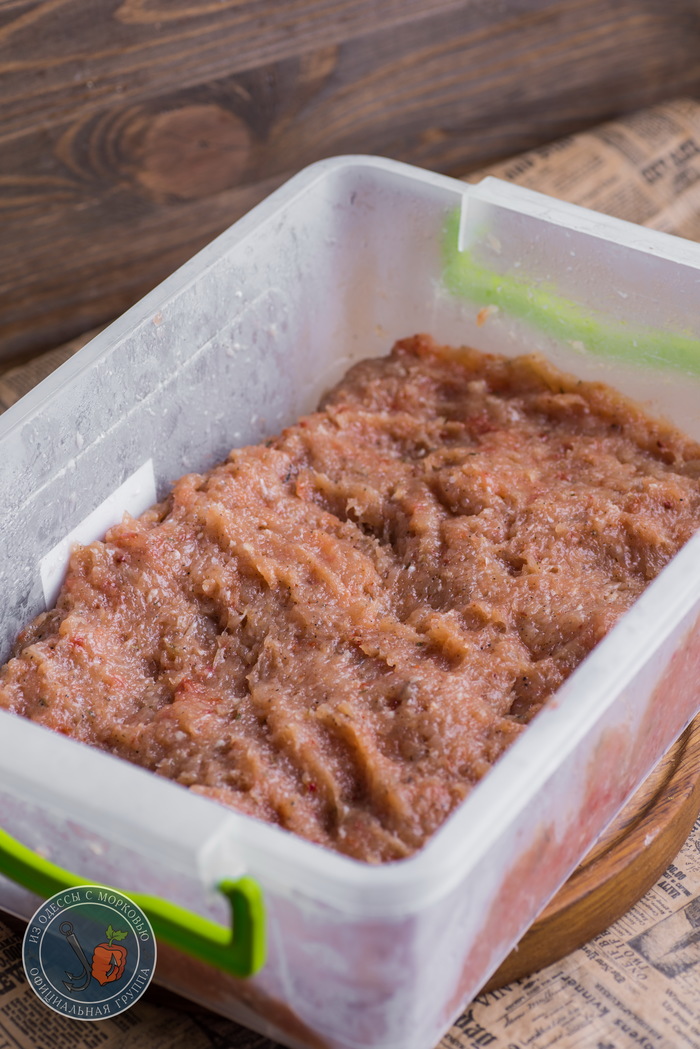 - Вода: указанные 120 мл – как по мне, минимум. Фарш при этом в меру тугой. Сейчас я немного экспериментирую и добавляю чуть меньше и больше. бОльшее количество влияет на удобство работы с фаршем, но лучше сильно не увлекаться.