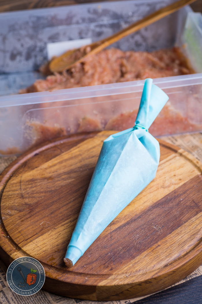 - Кондитерский мешок: для небольших порций можно обойтись и мешком. У меня силиконовый с али и я им пока полностью доволен. В бОльших масштабах можно использовать колбасные шприцы. Сейчас уже умельцы даже делают насадки с трубками, формующие сразу несколько колбасок одновременно. Но для начала проще пойти и купить кондитерский мешок.