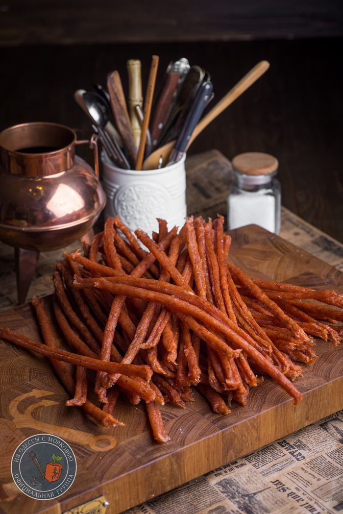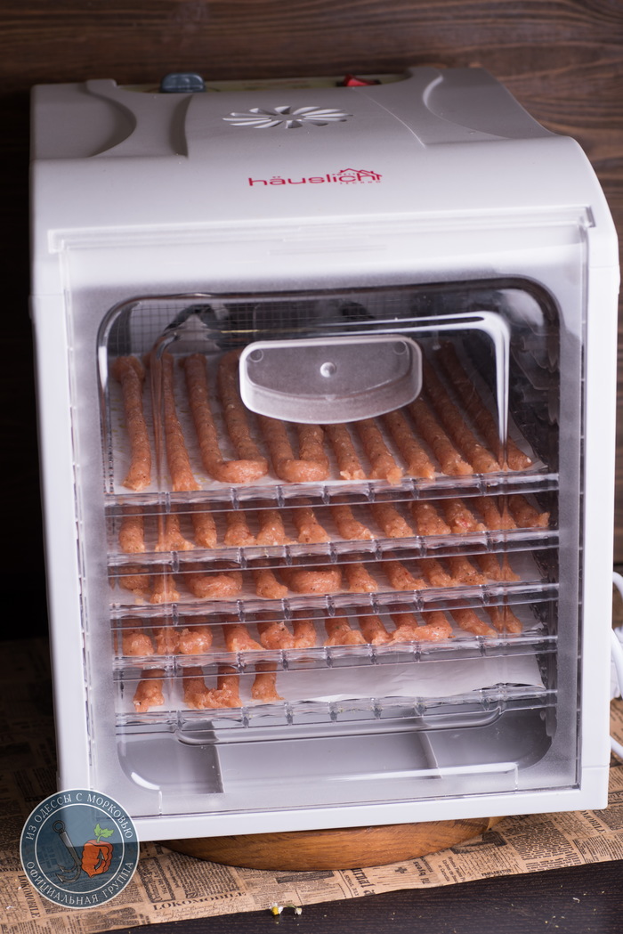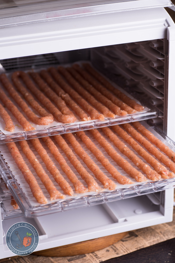 - Сушилка. Лучше всего получается именно в ней: выложил на лотки, закрыл, включил, забыл- вуалябля, готово. В духовке тоже получается. Но, как мне показалось, немного по-другому. Также, выкладывается пергамент или силикон на противень, также формируются колбаски и также выставляется температура, близкая к 65-70. Желательно, чтобы был внутренний термометр- иначе не угадаете. Дверь приоткрыть. Для этого можно вставить ту же деревянную лопатку. Через часа два можно перевернуть колбаски для равномерности. Также, если в духовке есть обдув, можно включить.