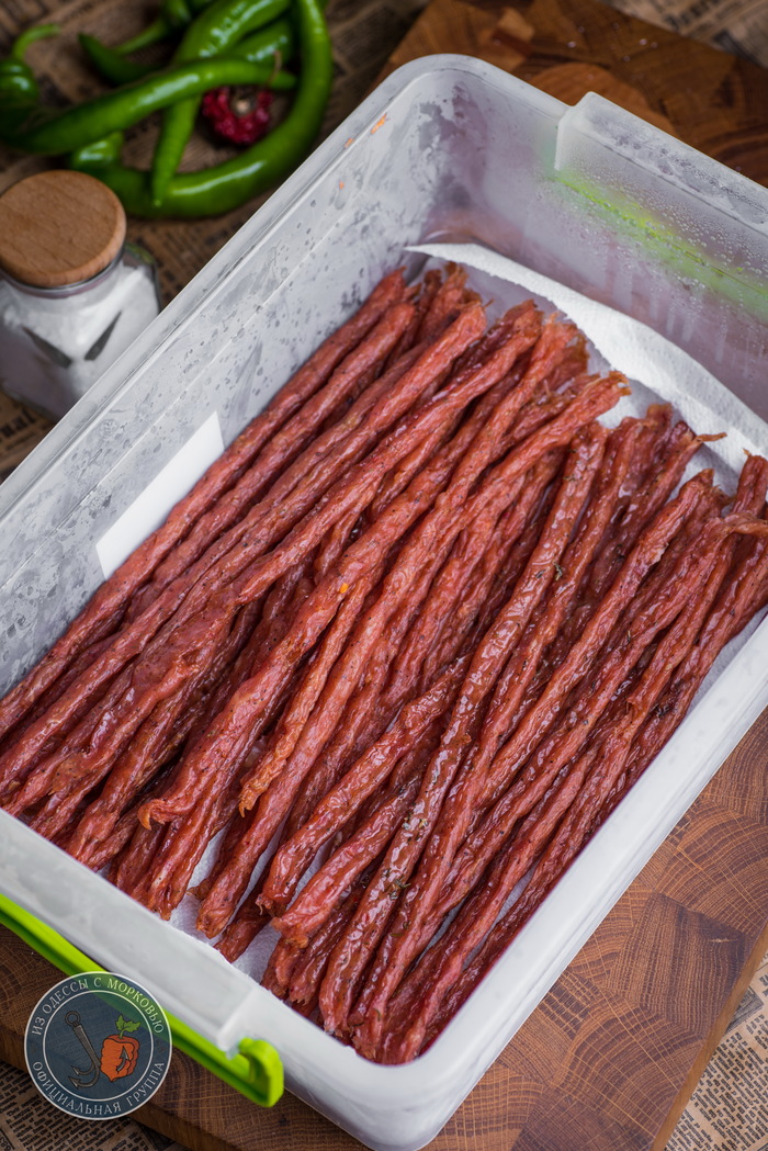 Выводы: что тут скажешь- отличная и крайне удачная закусь к пиву и не только. Не дубовая, в меру мягкая и упругая, легко жуется. Вся эта пряная ароматика тоже добавляет баллов в общем зачете. Получается вкусно. В плане удобства тоже все ок- руки не пачкает, выглядит вдохновляюще и так же кайфово и пахнет. Насчет аромата не скажу- поймете сами, как сделаете. В общем, я делаю колбаски по этому варианту уже несколько месяцев с тех пор, как купил сушилку и буду делать и дальше. Я проверял на друзьях- результат положительный.