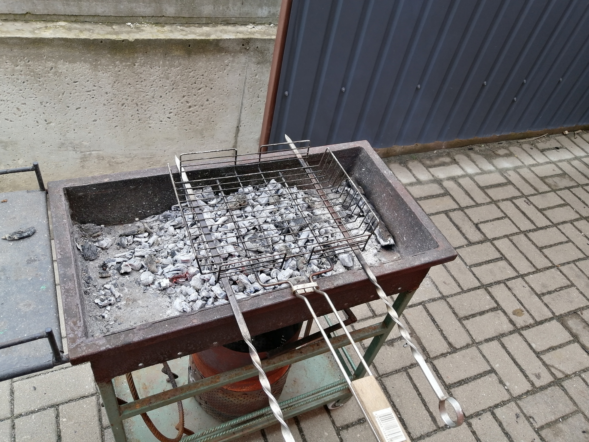 С помощью шампуров устанавливаю решетку на мангал. И прогреваю. Решетка должна быть горячей. Тогда ничего не пригорает. А можно и маслом смазать.
