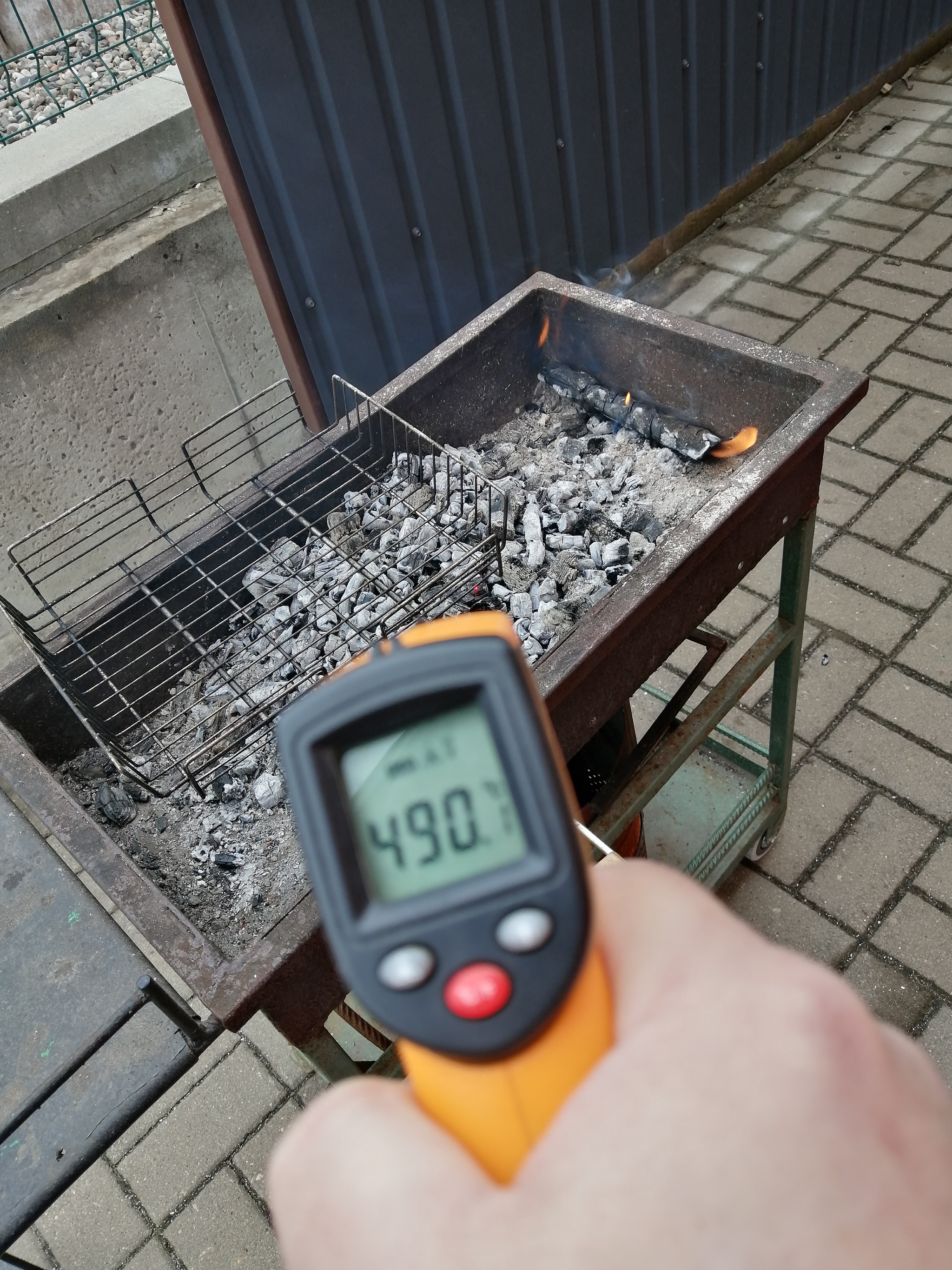 Угли побелели. Несколько взмахов махалом, сбить белый налет, что бы на колбасу не летело. И закладываю колбаски на решетку. На всякий случай замер времени. Время закладки колбасок на горячие угли 15.27. Готовлю угли из дров 40 минут. Не более. Темп-ра на углях 459 градусов.