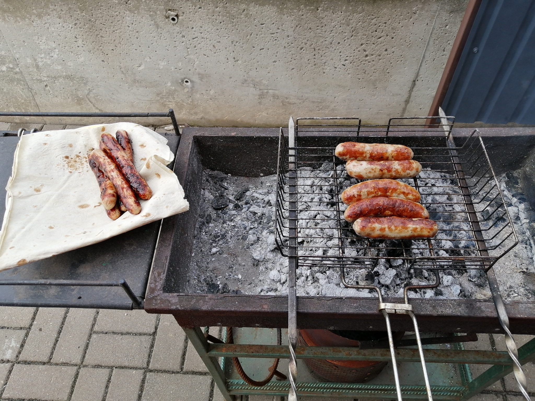 Время приготовления колбасок на огне 18 минут. Если бы я собирался еще что то жарить на мангале, тогда параллельно запустил бы стартер с углями, минут 15 назад, и партия углей была бы готова как раз.