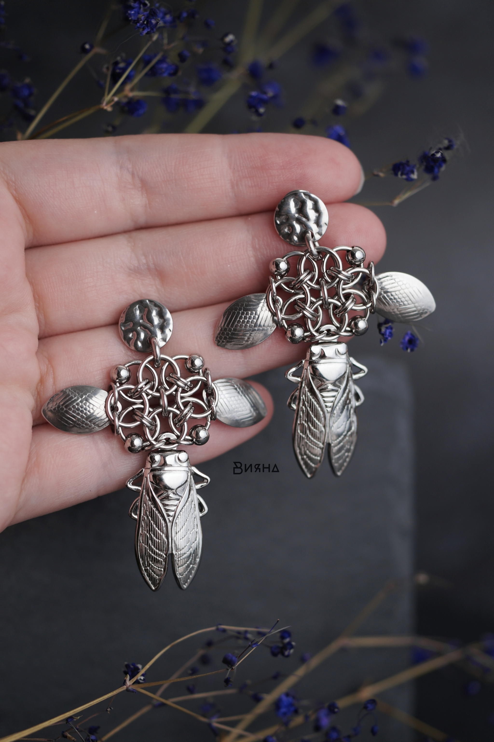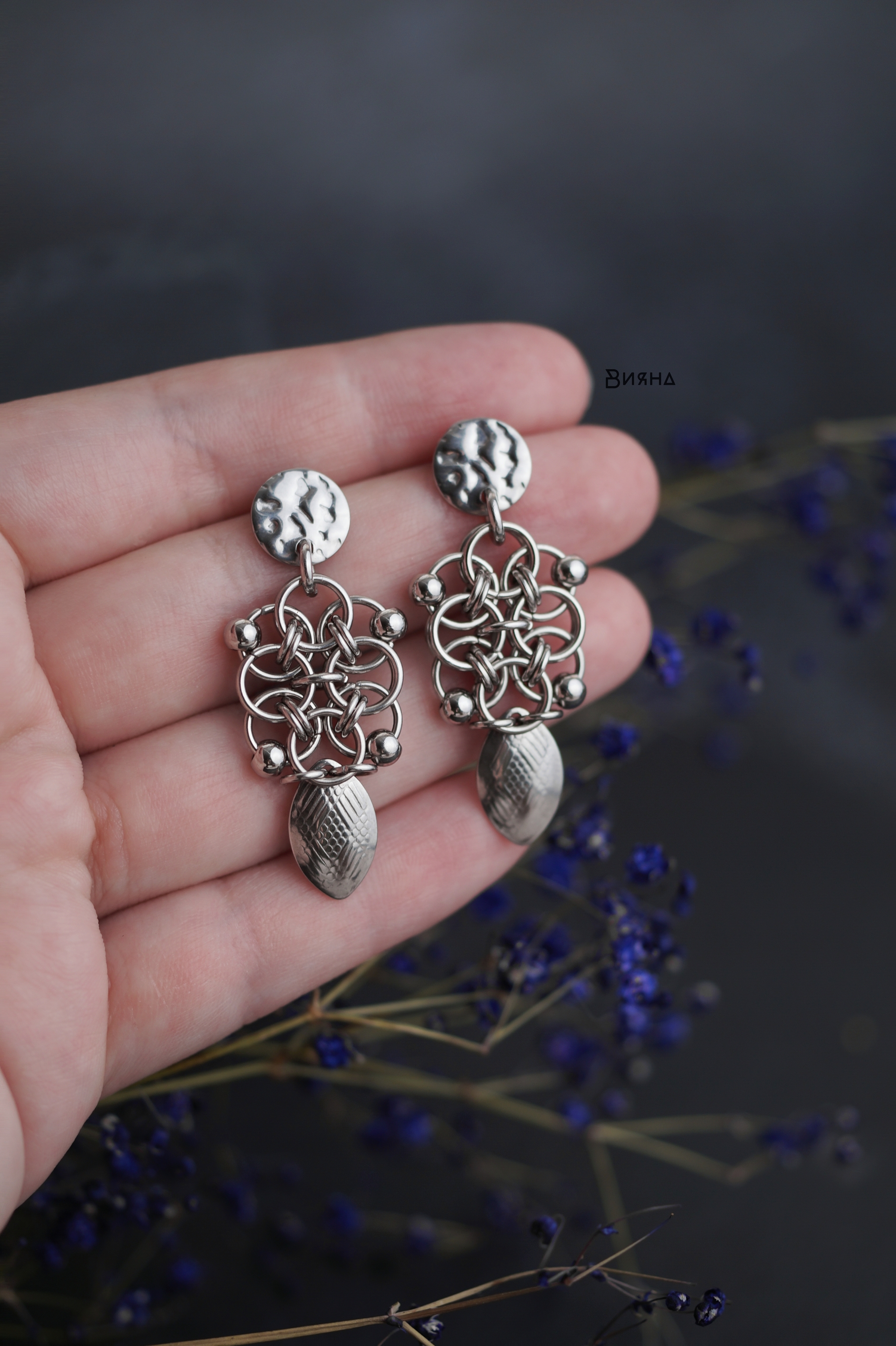 Захотелось добавить асимметрии. А ещё мне очень нравятся ловцы снов в кольчужном воплощении. Крупная серёжка слегка звенит при раскачивании.