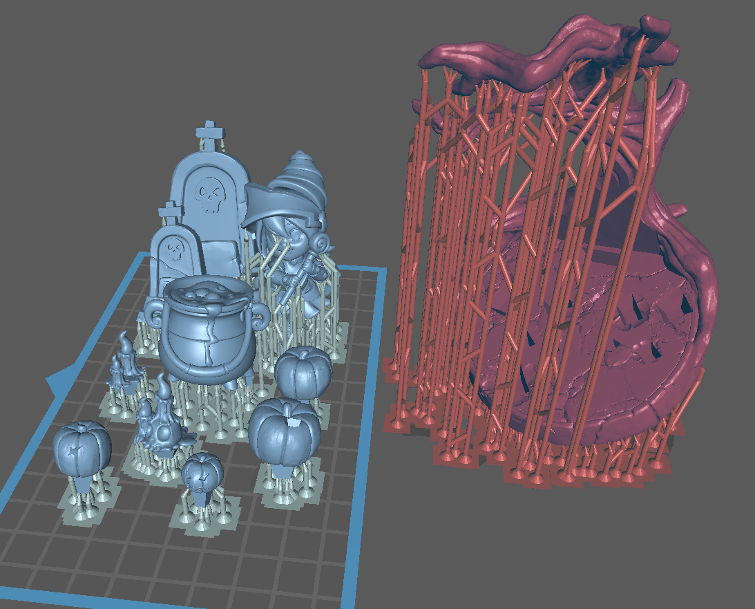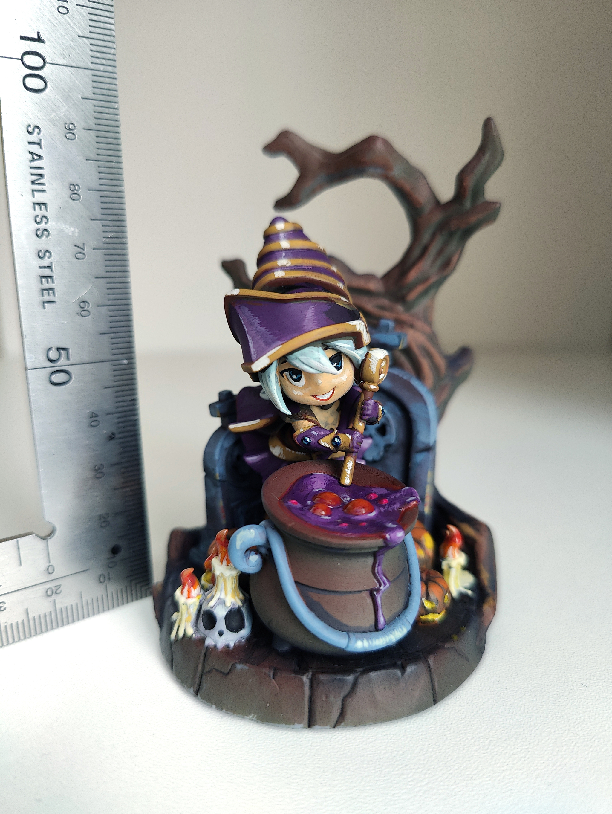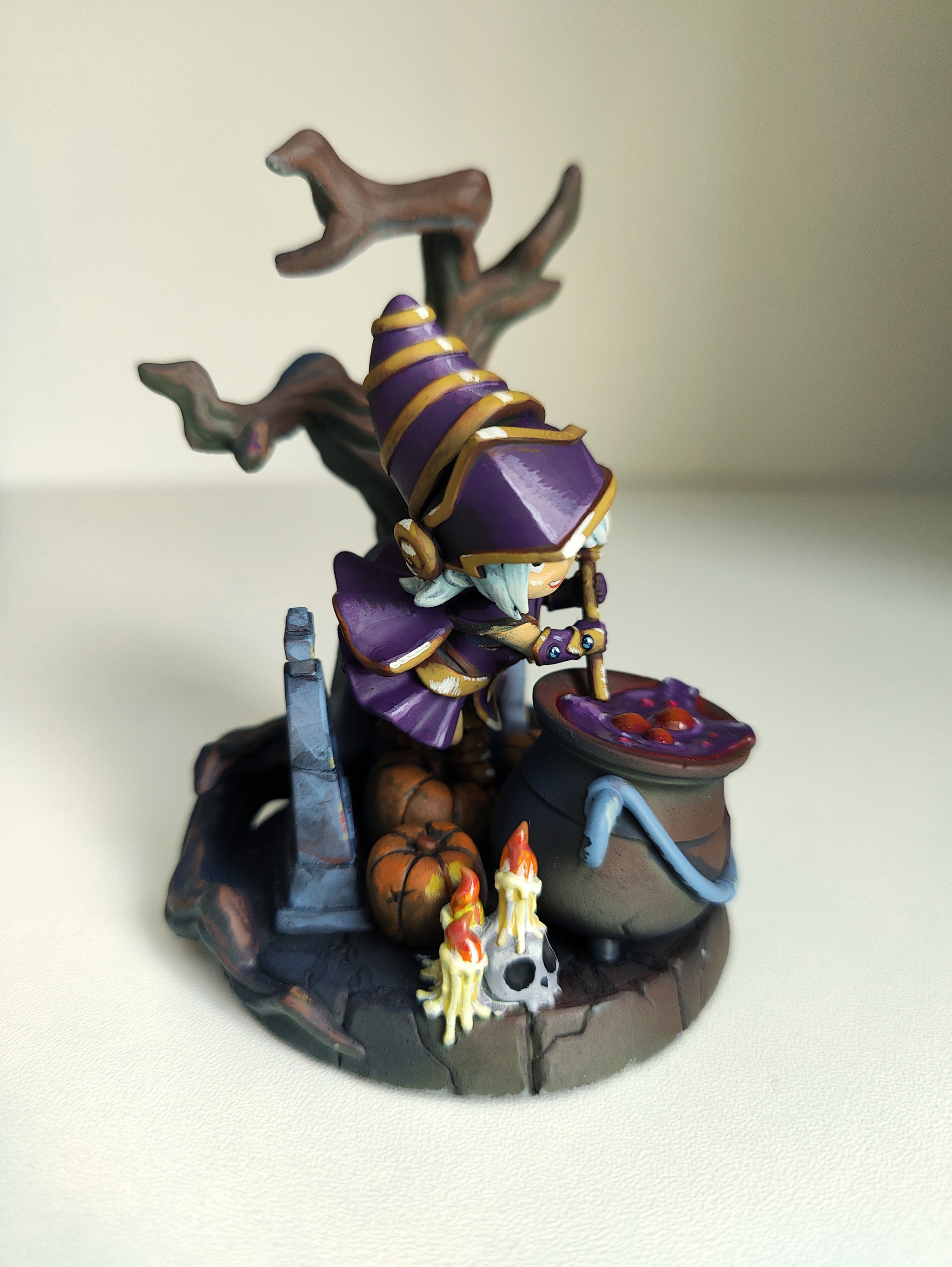 Здесь видно, что база полая, а вот котелок нет, хотя его тоже можно было сделать полым. Так бы и смолы сэкономил и принтеру было бы легче печатать. Процесс печати, сборки и покраски, к сожалению, не заснял. После печати, промывки и засветки, убрал поддержки и подшкурил неровности от этих же поддержек. Затем к базе приклеил все свечи, тыковки, надгробия. Котелок и девоньку изначально просто подставил, чтобы аэрографом все загрунтовать и сделать базовые цвета сразу на всю композицию.