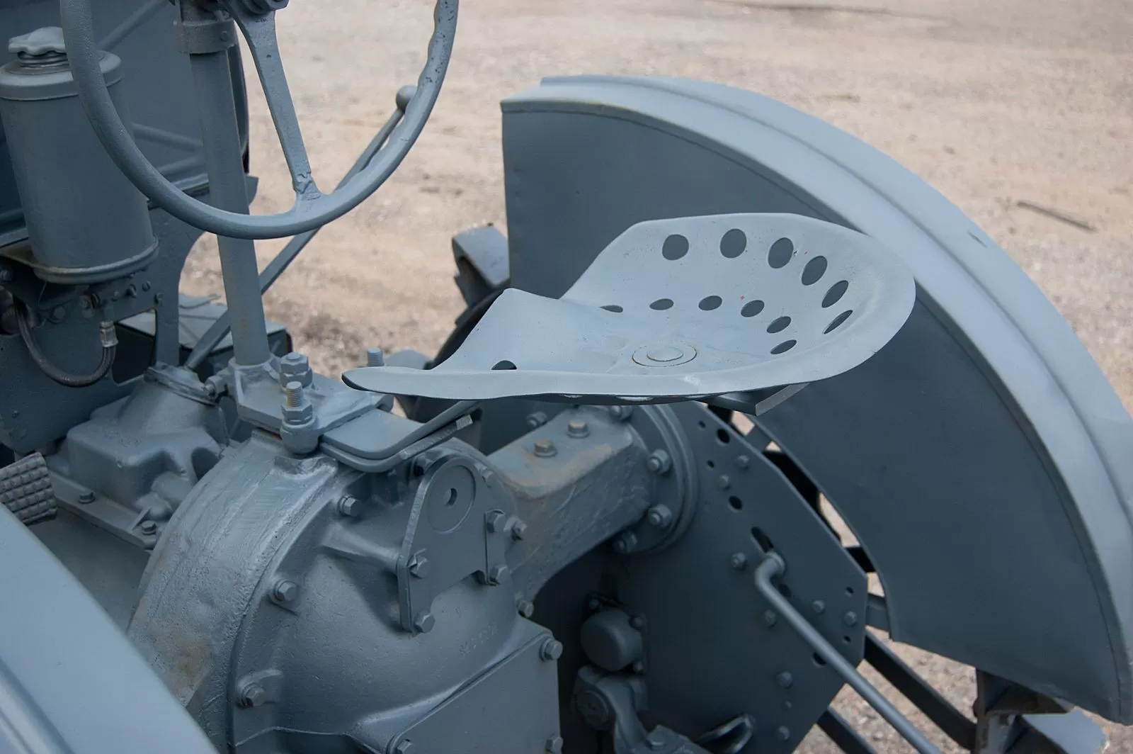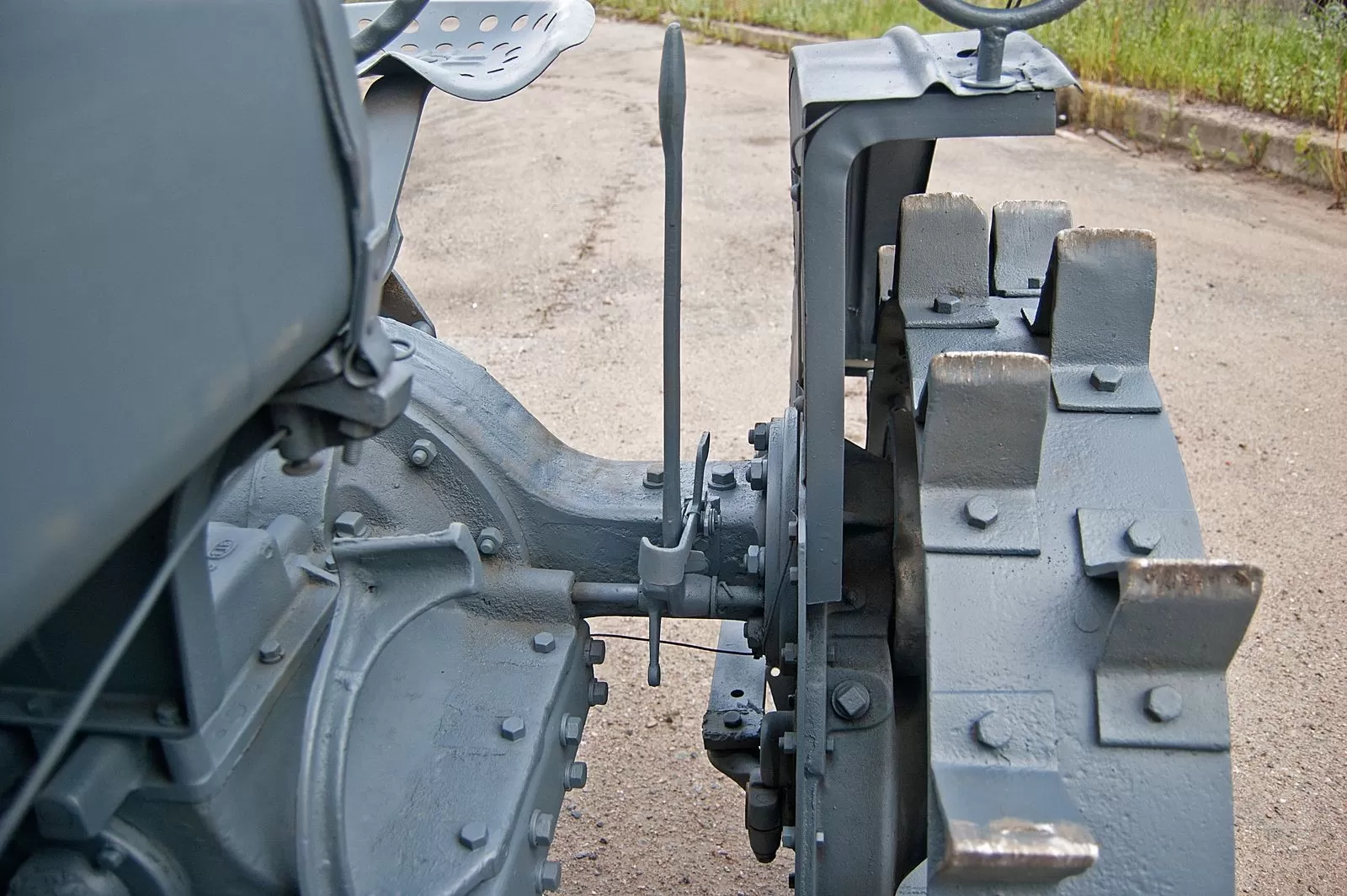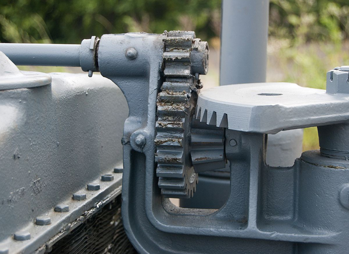 Трансмиссия интересна тем, что у трактора есть бортовые редукторы, причём левый – с тормозом. И этот тормоз на левом колесе – единственный тормозной механизм. Хотя я не думаю, что для остановки этого трактора нужно что-то серьёзнее, а как стояночный он работает вполне эффективно. Коробка передач – обычная механическая. Передних передач три, а схема переключения точно такая же, какой она была на всех американских машинах того времени и даже позже (например, как на Виллисе): первая – на себя и вниз, вторая – наверх, третья – вниз, задняя – на себя и наверх.