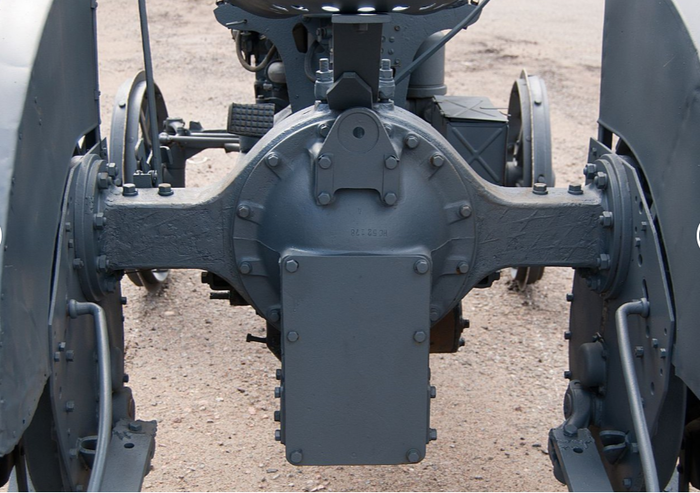 Задний мост намертво прикручен к раме, а передний всё-таки способен поперечно качаться. Всё это хозяйство стоит на клёпанной раме, которая сзади соединена как раз с картером заднего моста.