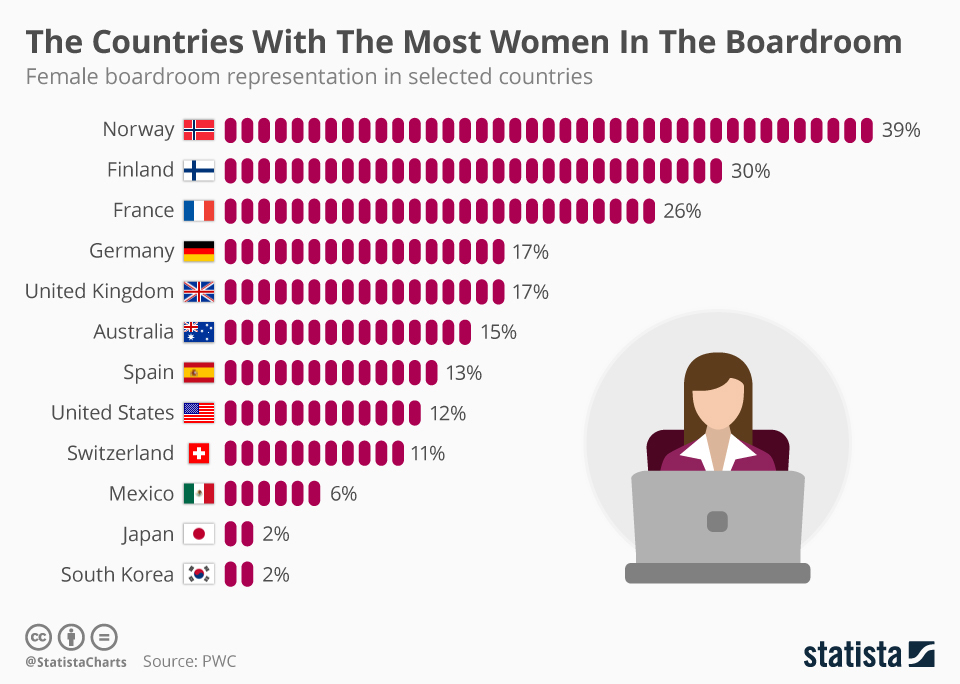 alvickus Количество женщин в советах директоров в разных странах. 9 лет назад Источник:https://www.statista.com/chart/4871/the-countries-with-the-m... Женщины Мужчины и женщины Бизнес Инфографика