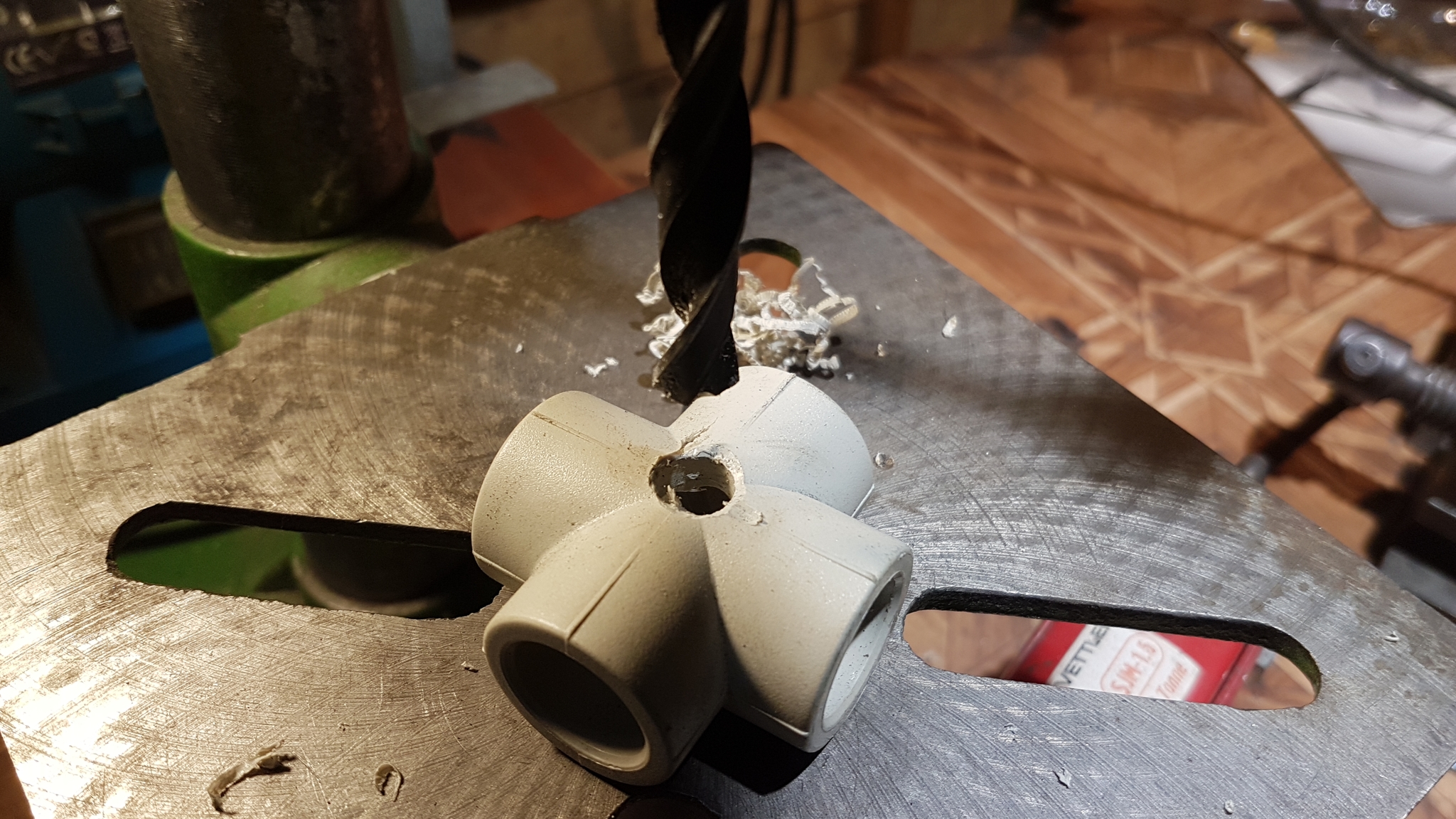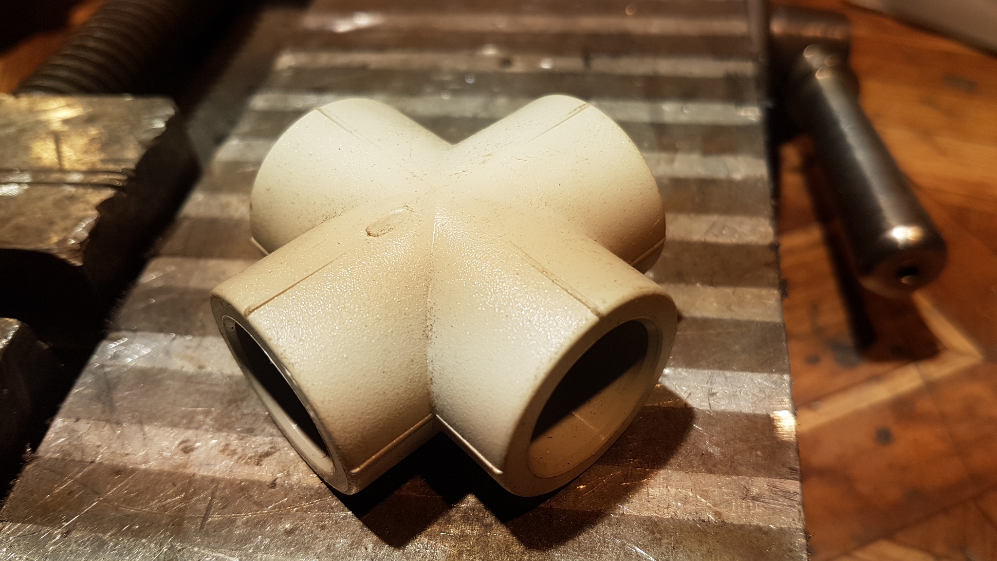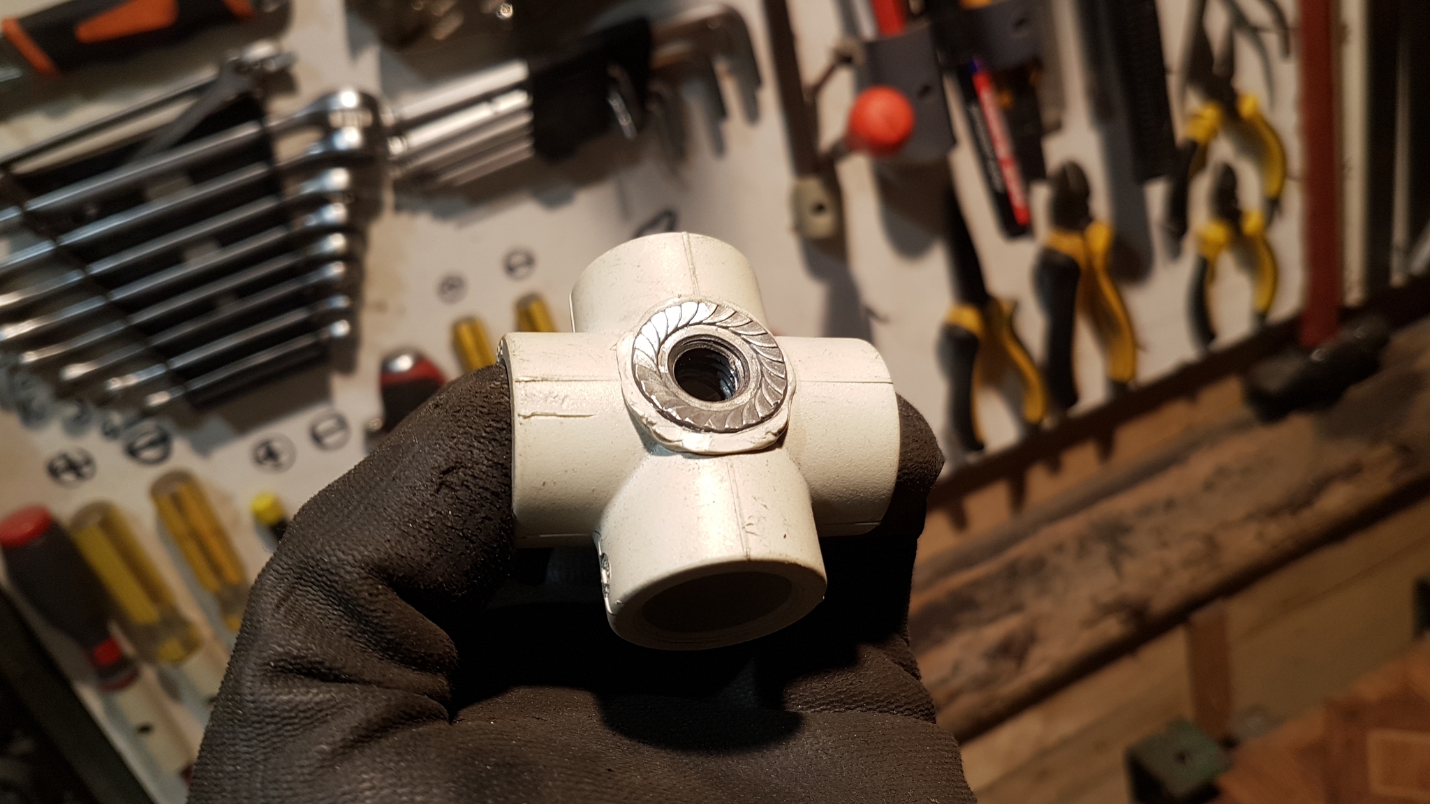 В какой-то момент столкнулся с надобностью такой ручки с гайкой. В окрестных магазинах ничего подходящего не было, резать из фанеры с вклеиванием гайки - долго и нудно, а ручка нужна вотпрямщас. Казалось бы купи гайку - барашек и успокойся, но она в данном конкретном случае не вариант, т.к. не обеспечивает необходимого усилия затягивания рукой - нужно что-то с бо́льшим маховиком. И тут на глаза попался горячо любимый всеми агро- DIYшниками кусок полипропилена в виде крестовины для соединения труб 20мм.
