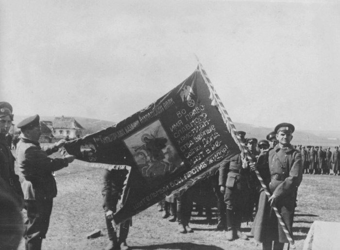 Парад 1-го Синегорского казачьего Атаманского полка вермахта со знаменем в одном из сел Украины.