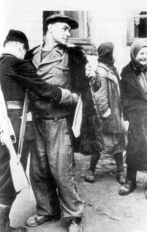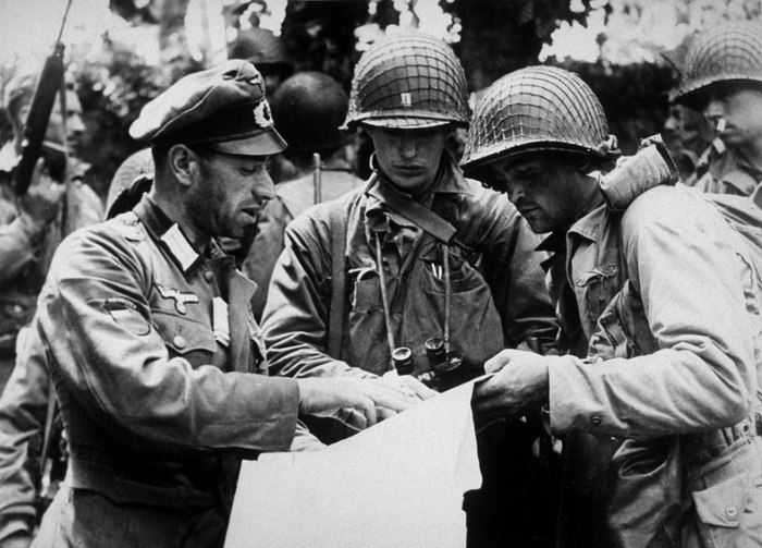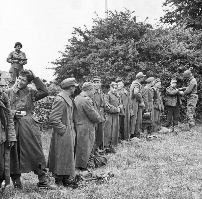 Солдаты 1-й армии США проводят обыск пленных одного из «восточных» батальонов (Ost Bataillon) сформированных из красноармейцев, перешедших на сторону противника.