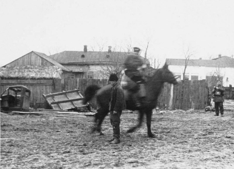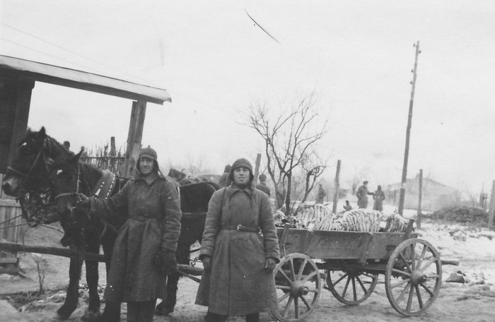 Добровольные помощники немцев (хиви) из числа советских пленных рядом с подводой.