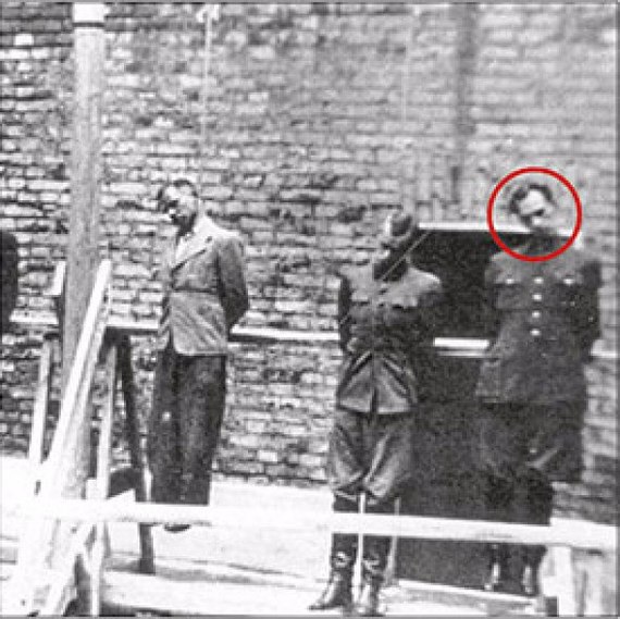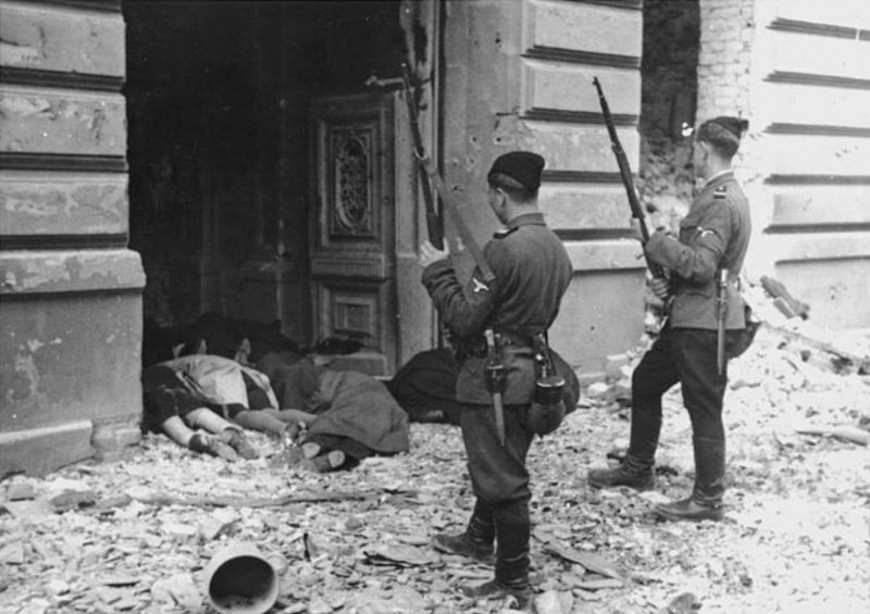 Двое украинских членов СС, известные как «аскари», смотрят на тела убитых женщин и детей во время подавления восстания Варшавского гетто.