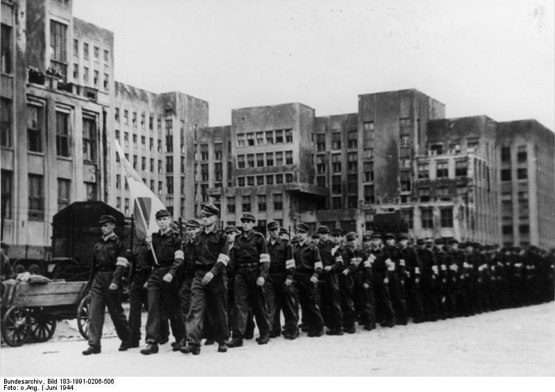 Казаки (в каске — казачий офицер) наблюдают за боем во время подавления Варшавского восстания 1944 года