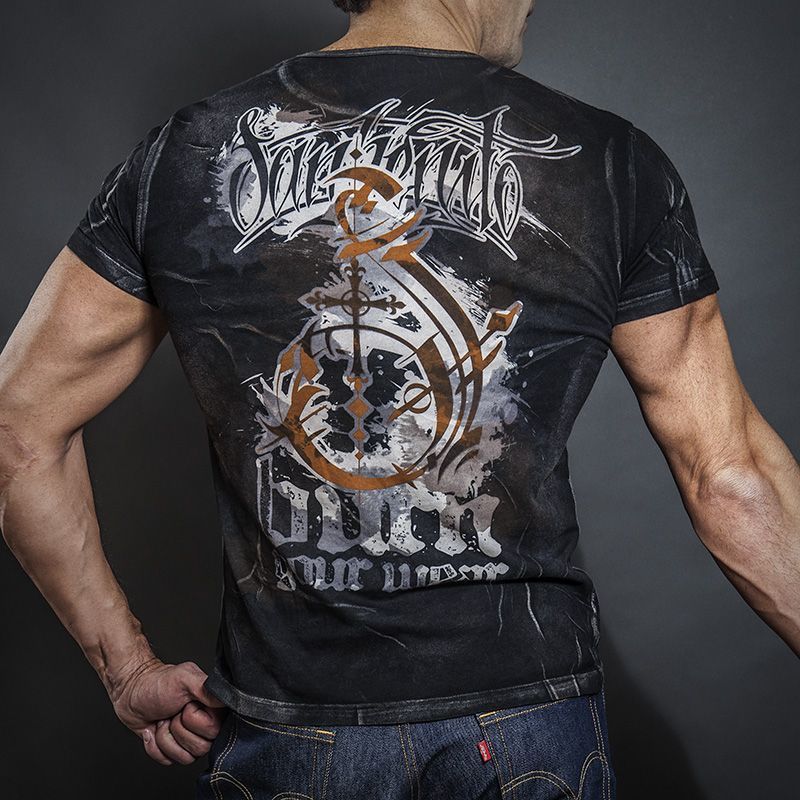 Есть такой бренд - Affliction. Раньше они делали одежду для бойцов MMA. У меня 2 футболки, каждой по 5 лет, носил их часто, а они почти не выцвели, сделаны из хлопка и хорошо дышат. Правда сейчас эта одежда стоит непомерных денег.