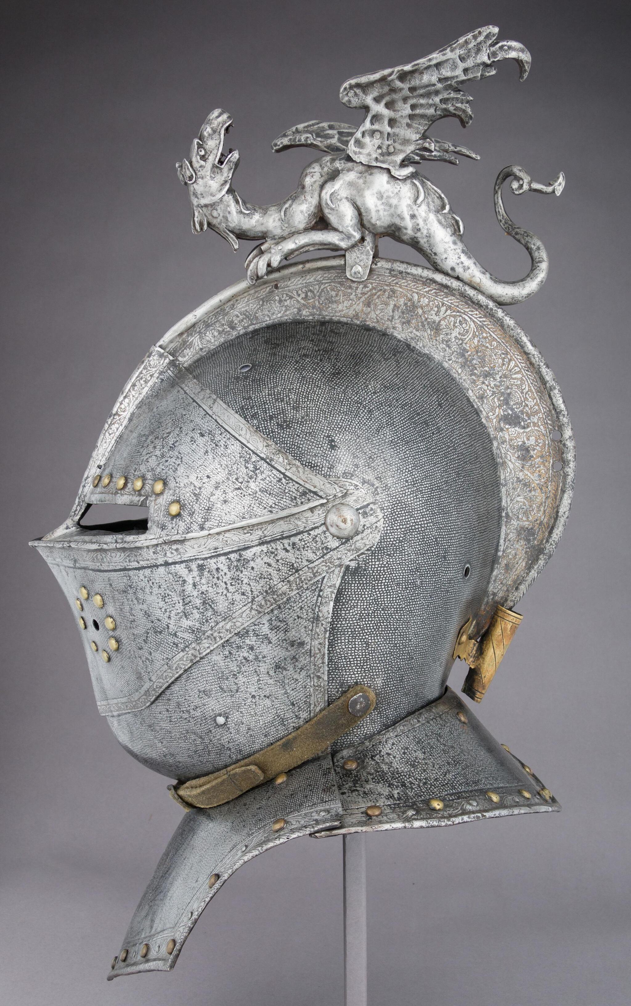 Французский закрытый шлем из стали, золота, кованого железа и латуни. Около 1630 г. н. э. Ныне хранится в Метрополитен-музее.