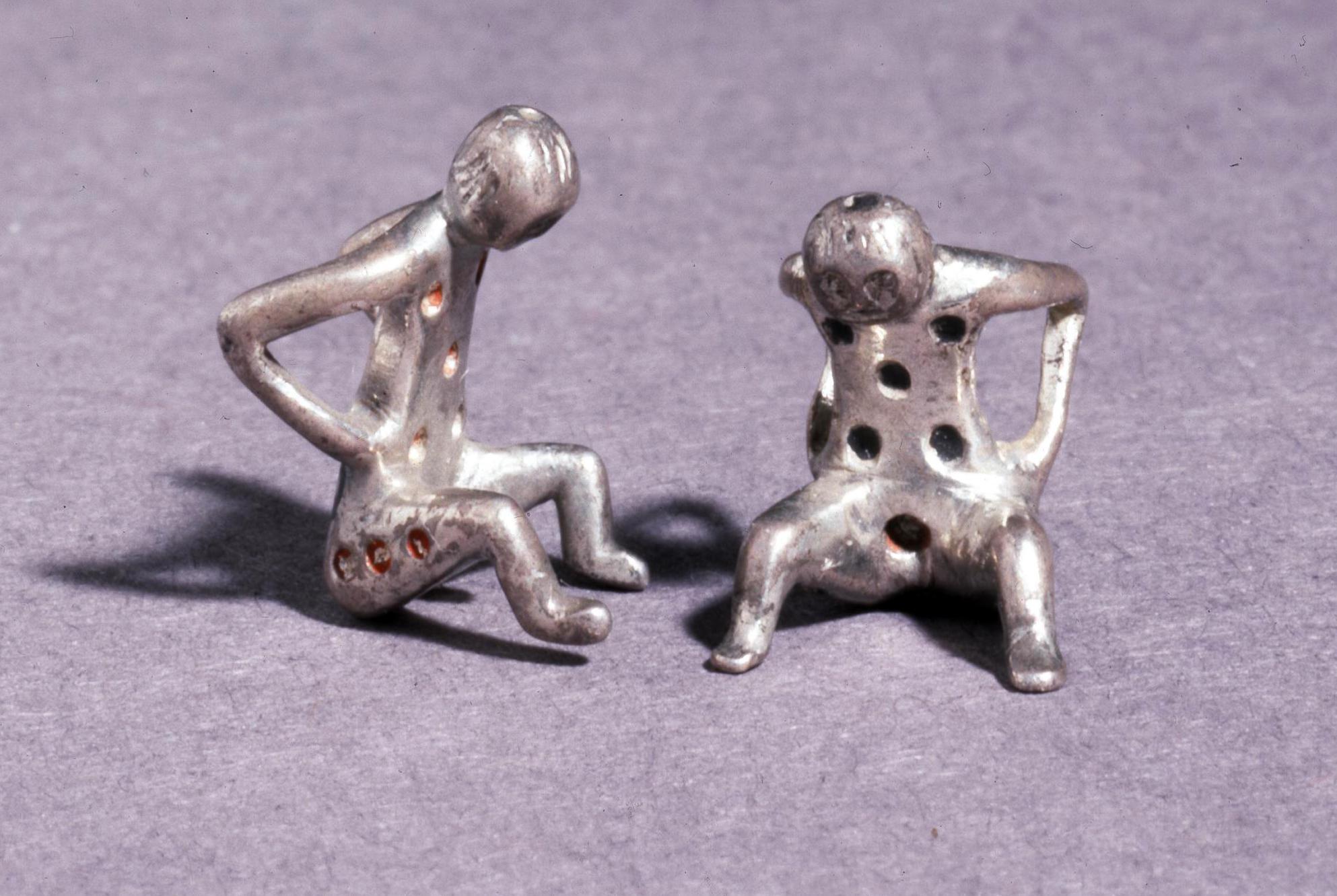 Римские антропоморфные игральные кости в форме присевших фигур. Серебряные игральные кости работают почти так же, как обычные, на каждой грани определённое количество красных точек от 1 до 6. I–II вв. н. э., Британский музей