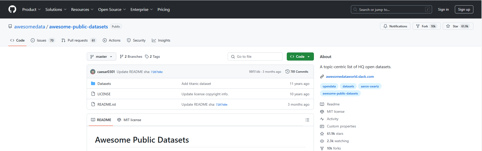 2. Awesome Public Datasets — GitHub-репозиторий с огромным списком бесплатных датасетов на все случаи жизни. Здесь вы найдете данные по здравоохранению, финансам, географии, а также редкие специализированные наборы для узких исследований. Отличный ресурс для вдохновения и поиска необычных датасетов.