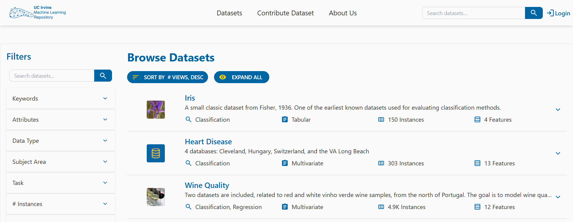 3. UCI Machine Learning Repository — классический источник датасетов для исследований и экспериментов. Этот репозиторий существует уже много лет и содержит сотни датасетов для задач классификации, регрессии и кластеризации. Отличный выбор для тестирования новых алгоритмов.