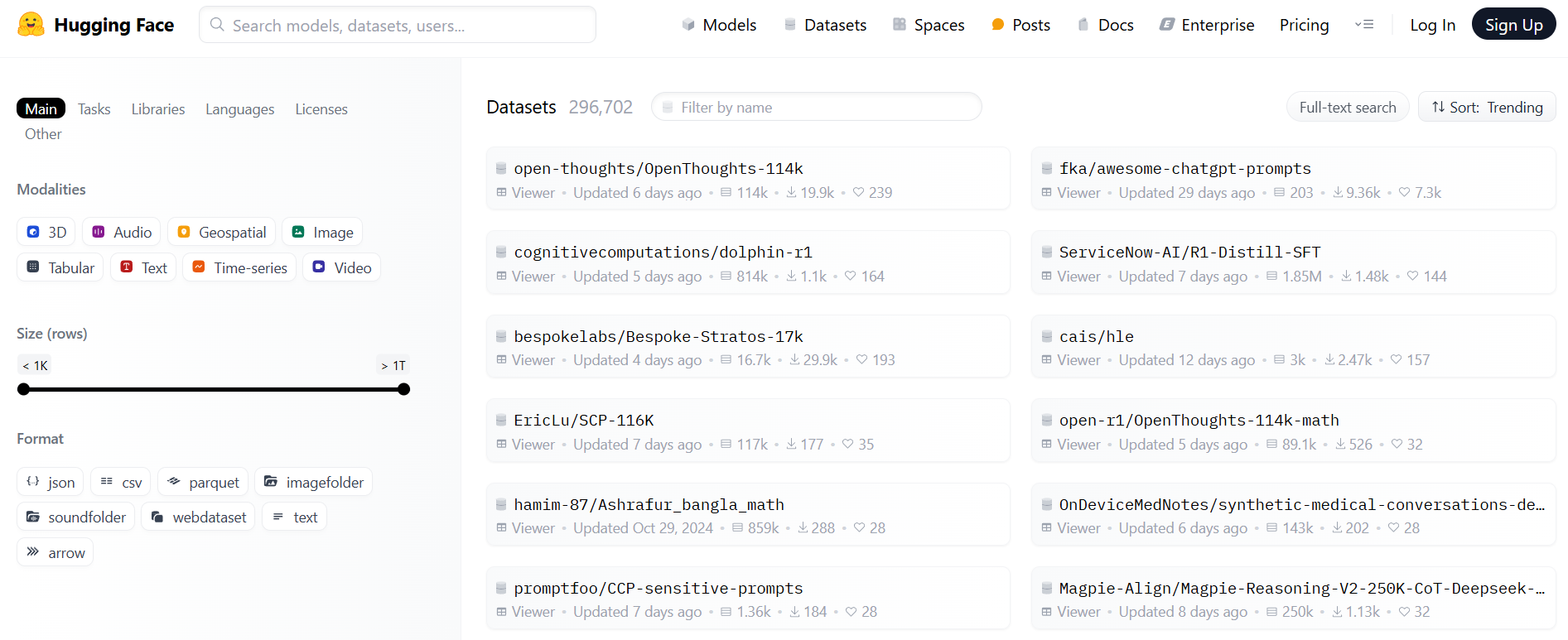 5. Hugging Face Datasets — библиотека от платформы Hugging Face, где собраны датасеты для задач обработки естественного языка (NLP), компьютерного зрения и машинного обучения. Поддерживает удобную интеграцию с моделями и фреймворками для обучения ИИ.