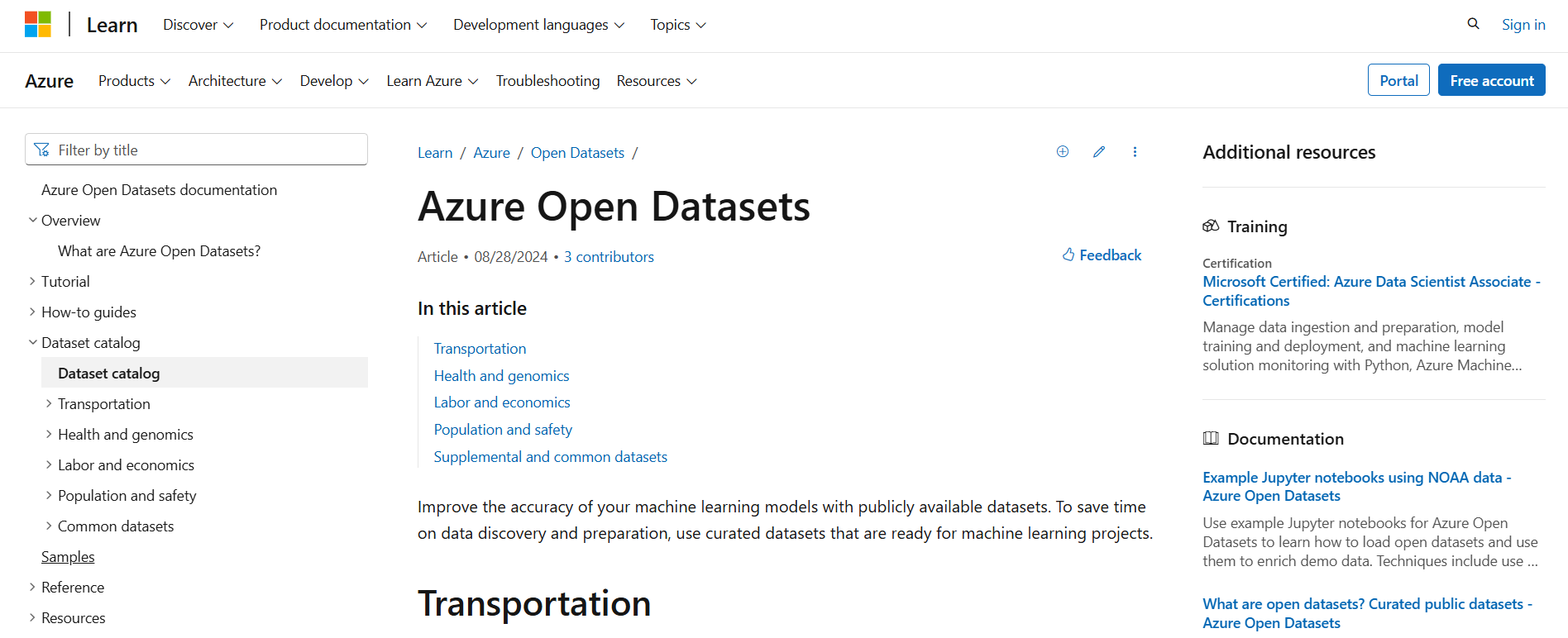 6. Azure Open Datasets — коллекция открытых датасетов от Microsoft Azure. Здесь вы найдете данные для задач в области здравоохранения, финансов, демографии, транспорта и многого другого. Отлично подходит для использования в облачных проектах и при работе с большими данными.
