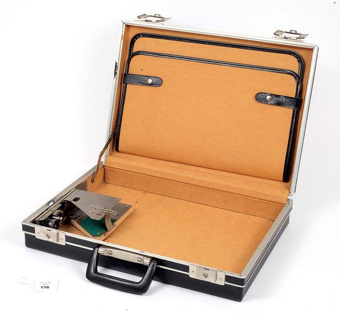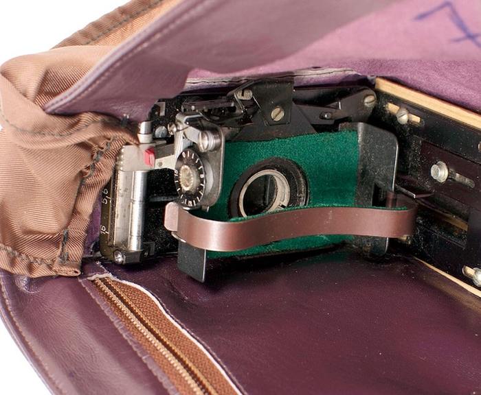Кейс-дипломат со встроенной камерой «Зола». Первый советский аппарат для конспиративной съемки с автоматической сменой выдержки. Очень полезная функция при наблюдении за человеком, который из дома быстро выходит на солнце или, наоборот, заходит с улицы в темное помещение. 1970-е годы. 850 фунтов