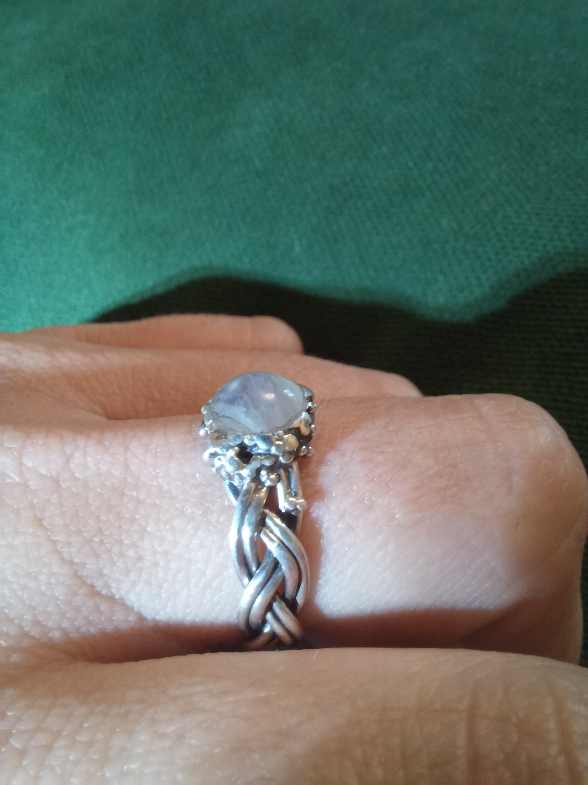 Сначала был опал, я опалила его горелкой во время работы и он стал янтарно-прозрачным, через некоторое время я в рабочей запаре кинула его после полировки в УЗВ-мойку и он треснул и пал смертью храбрых. Потом там побывал янтарь и вот теперь адуляр.