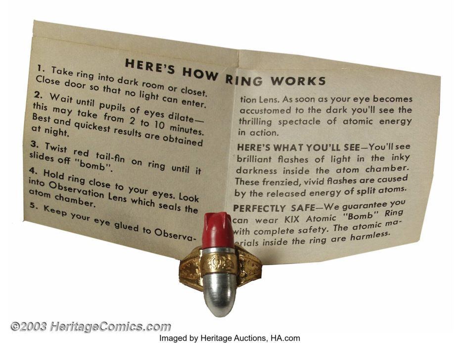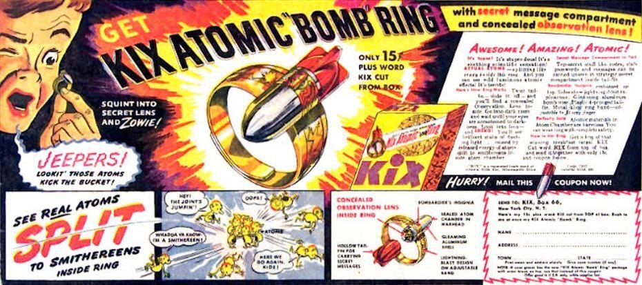 Бомбежка Хиросимы и Нагасаки, увы, не заставила мир ненавидеть ядерное оружие, даже наоборот - сделала его модным. Иначе как объяснить, что компания Kix Cereal в 1947 году для продвижения своих хлопьев выпустила игрушку-кольцо Lone Ranger Atom Bomb.
