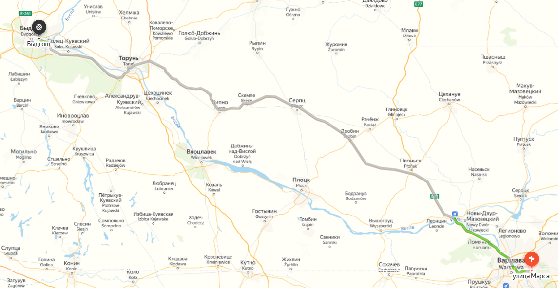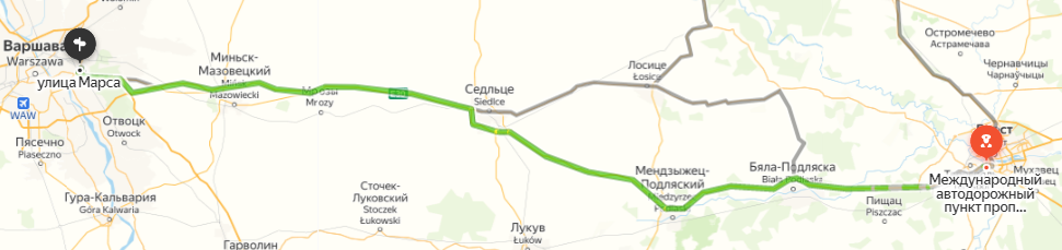 На трасс понравилось наличие катафотов справа красных, слева белых и освещённые перекрёстки. На скорости 120 нагнал автобус с белорусскими номерами, который шел около 100 и сел ему на хвост. Не доезжая километров 20 до Варшавы, понял, глаза слипаются и остановился проветрится и поссать. Проснулся Олег и сказал, что может вести авто, на этом моя смена кончилась. Выпил грамм 150 водки и отрубился на пассажирском сидении. Но "недолго музыка играла" на подъезде к Варшаве меня разбудили, нужно было понять маршрут отмеченный на факсе карты. Больше я не спал.
